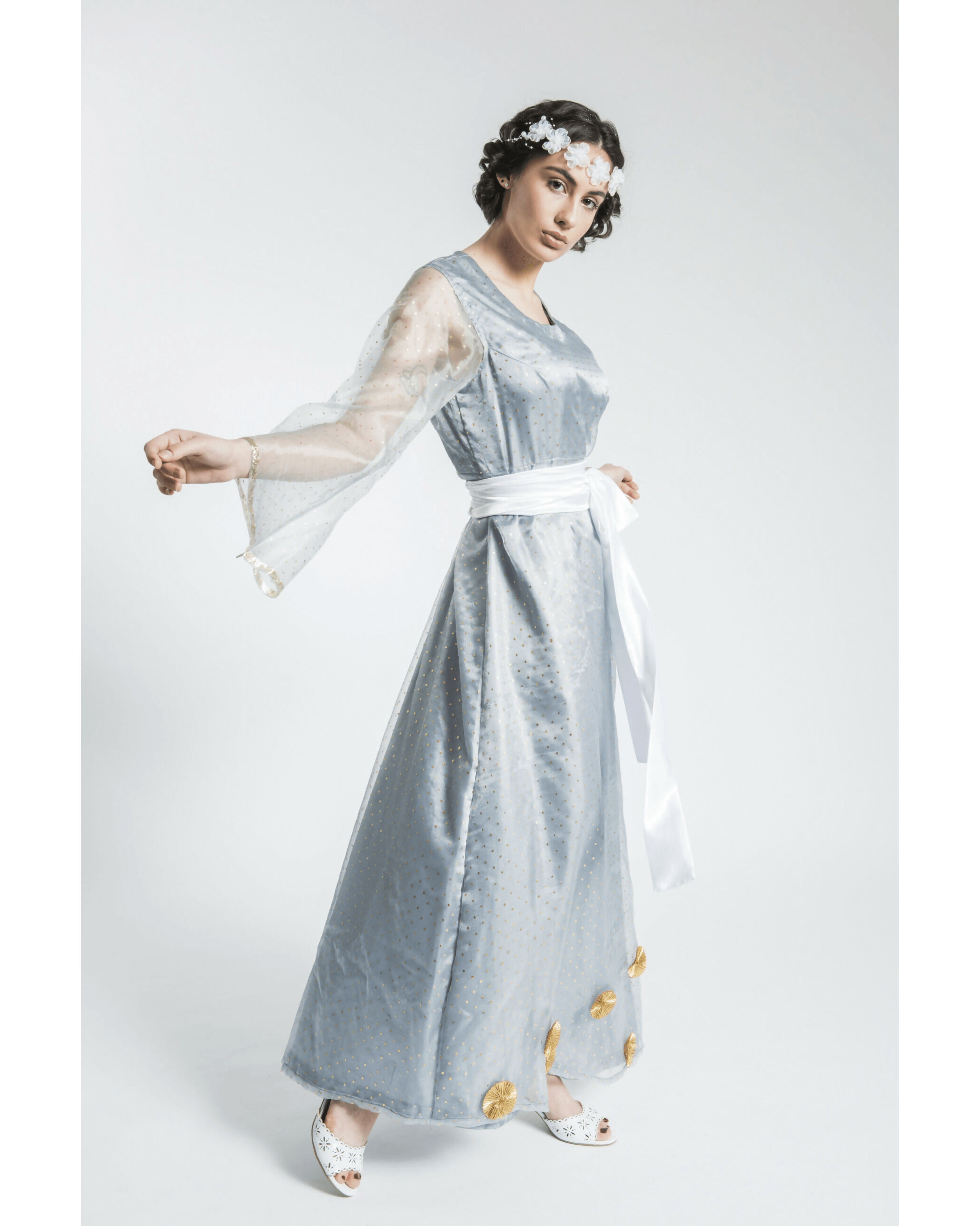 This chiffon light blue long dress is adorned with gold polka dots and embellished with intricate Indian gota flowers. It is complemented by a white satin obi belt, adding a touch of elegance and sophistication to the ensemble.