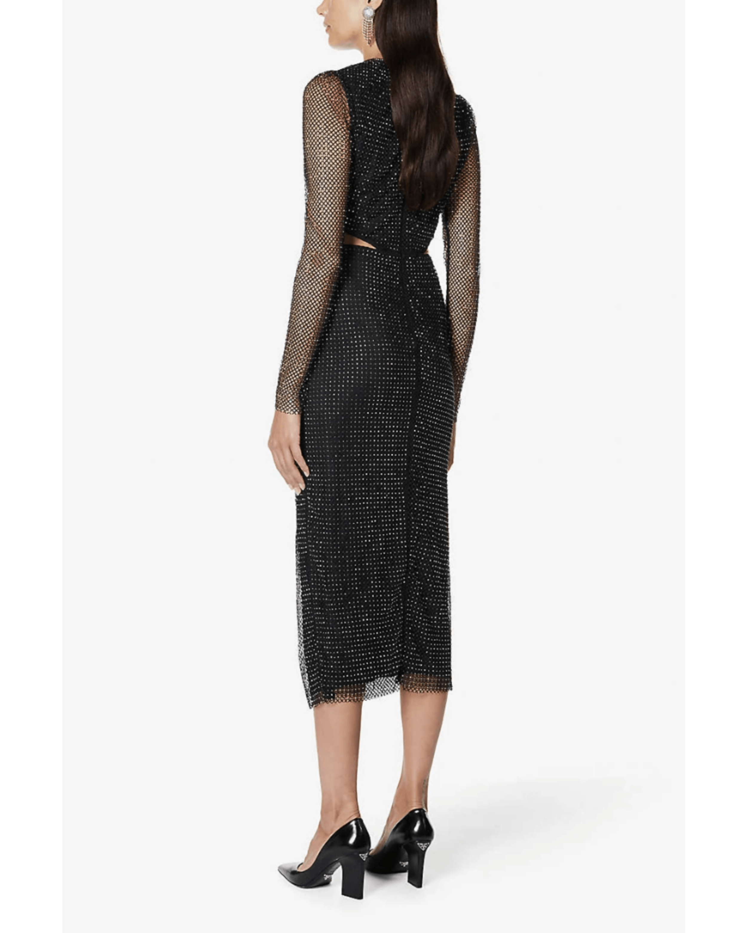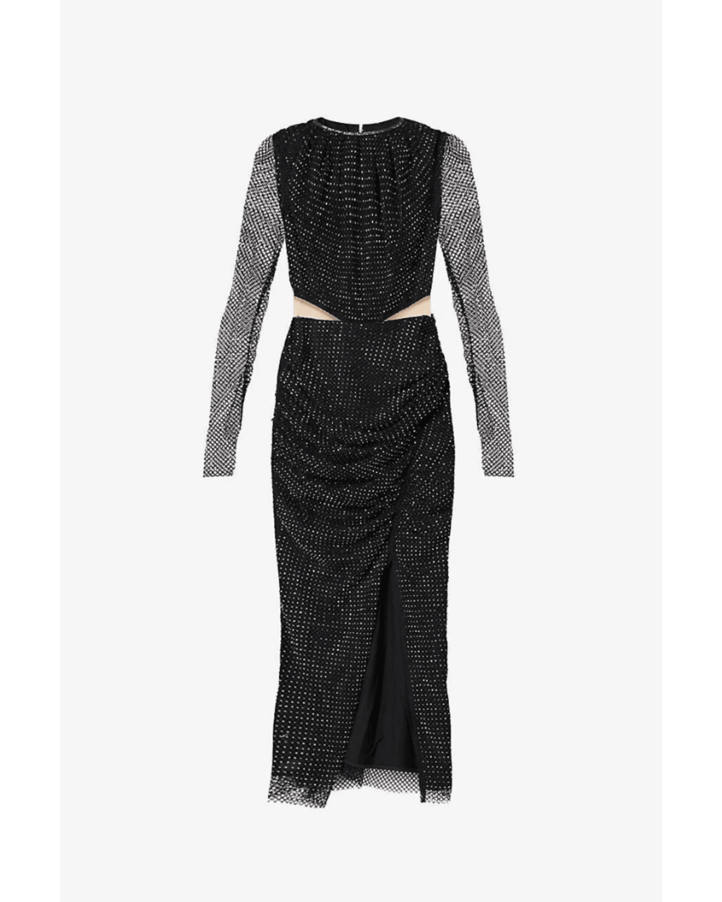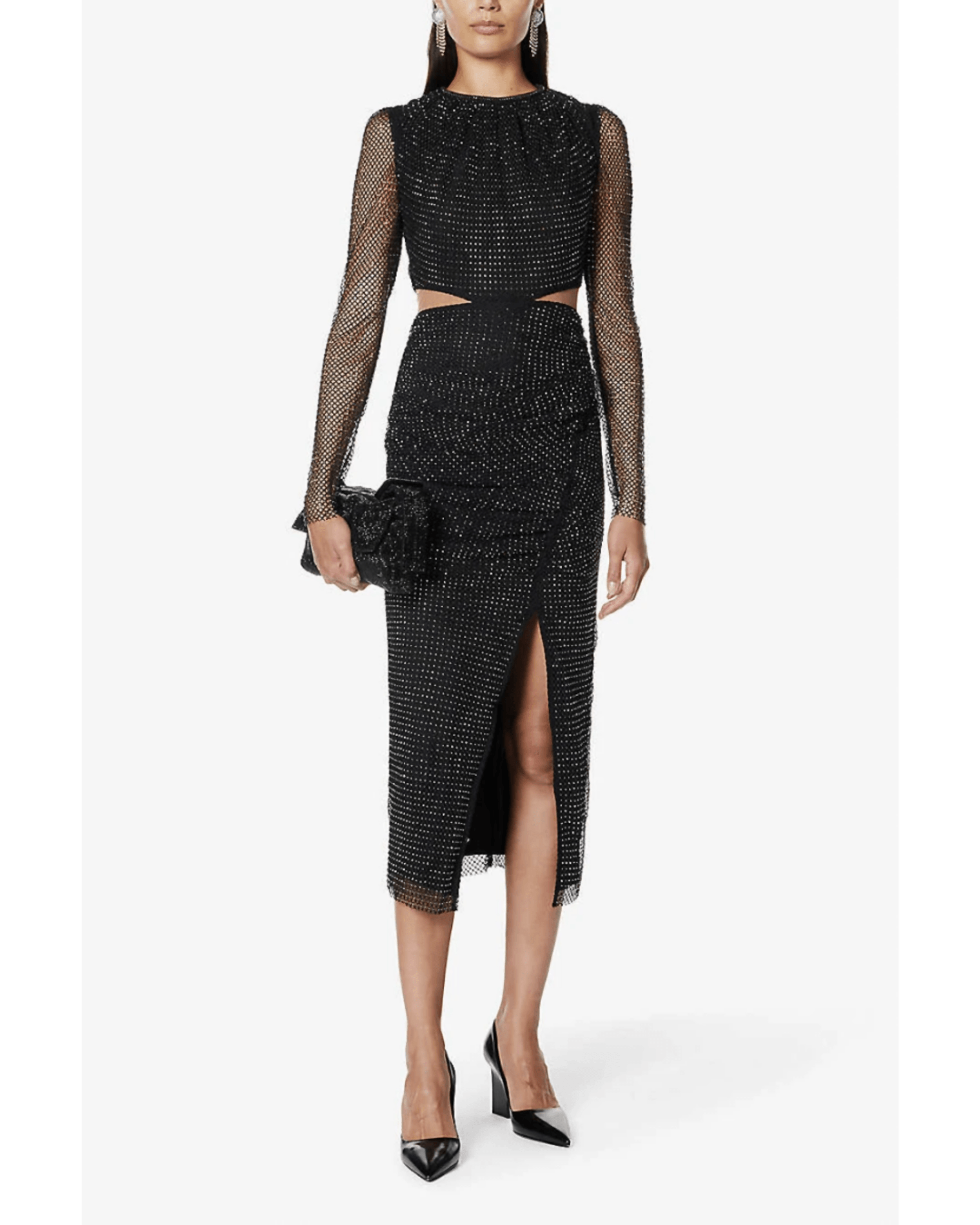 Self-Portrait crystal-embellished black woven midi dress. Slim fit, round neck, long sleeves, sequin overlay, mesh panels at sides, ruching at front, split at front, embellished trims 96% polyester, 4% elastane; lining 100% polyamide Concealed zip fastening. Midweight, stretchy True to size.