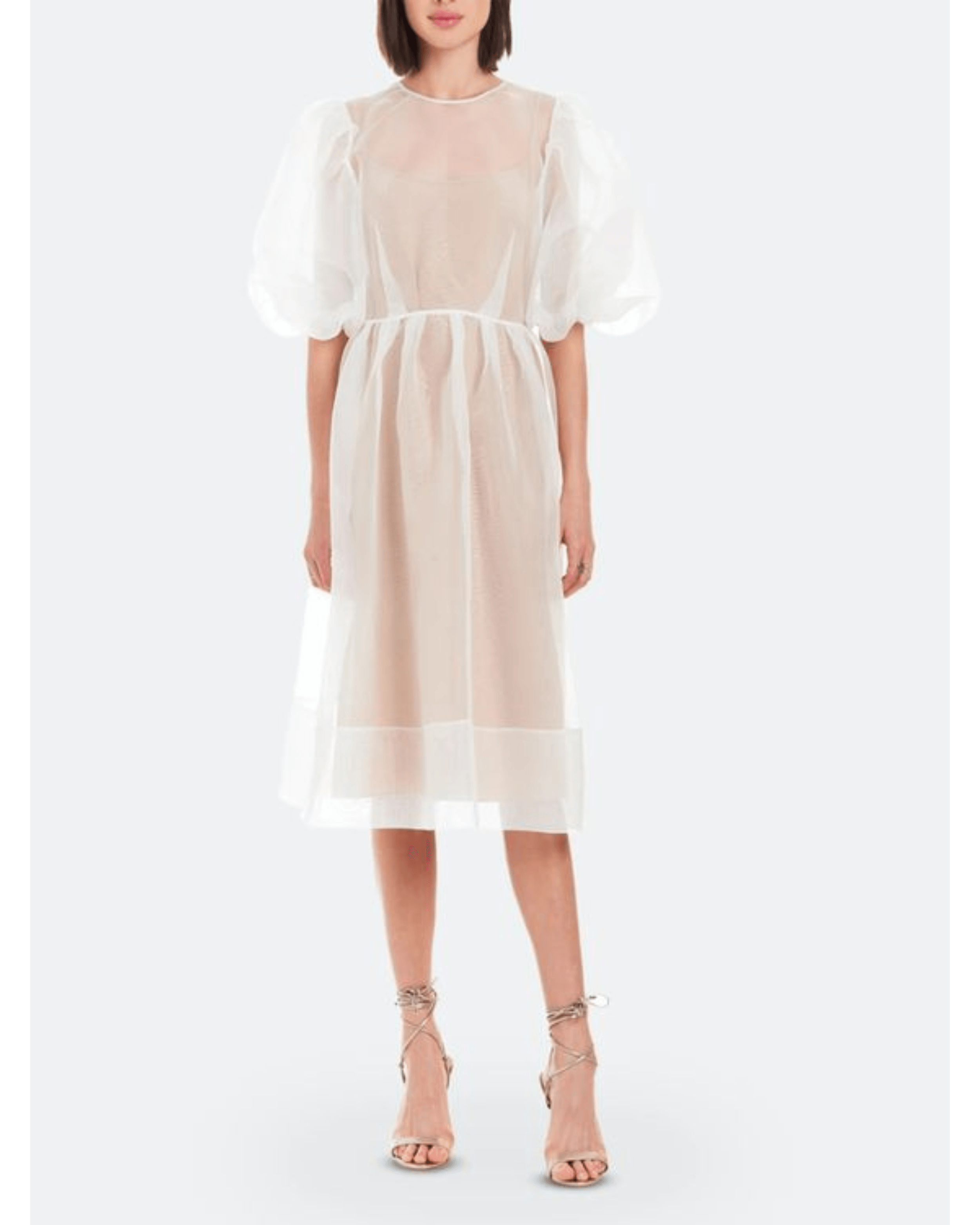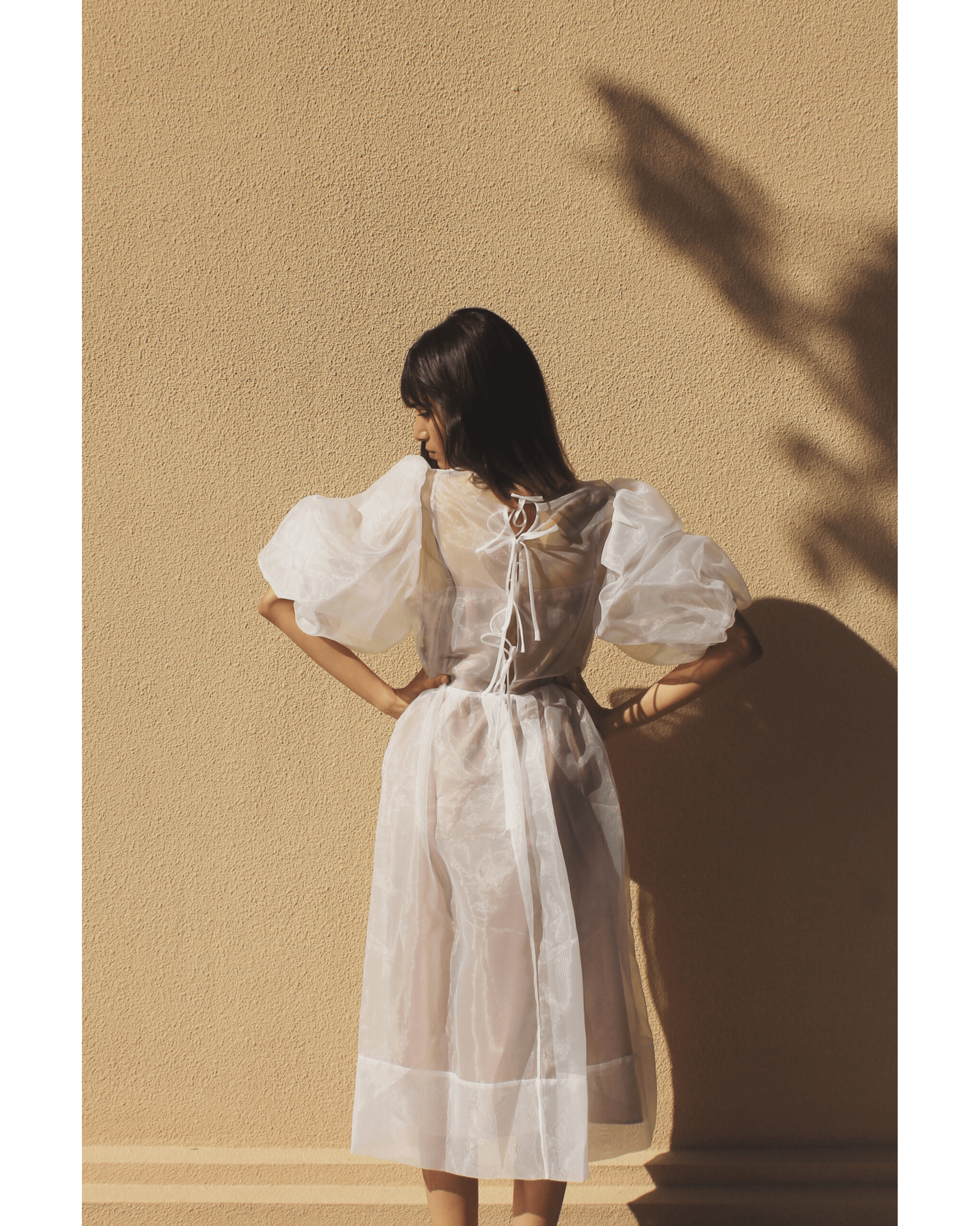 Sheer midi dress with puff sleeves and paired with an inner dress.