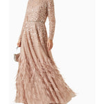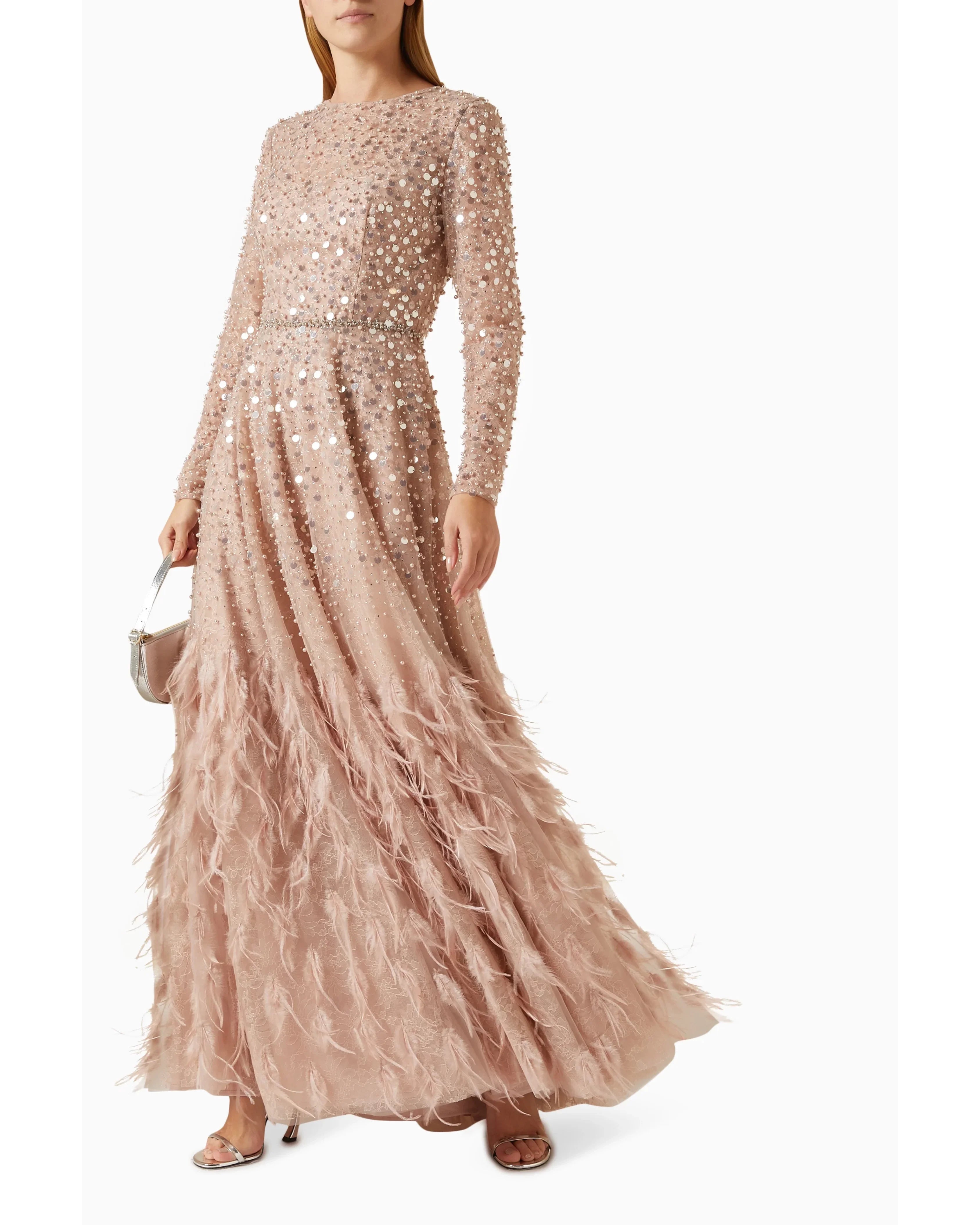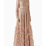 Expertly crafted in a soft dusty rose hue, this gown features a luxurious mesh overlay adorned with disc sequins, delicate hand-embellishments, and a fully feathered hemline that moves beautifully with every step. The high illusion neckline, long sleeves, and subtly cinched waist create a sophisticated silhouette, perfect for galas, red carpet events, or high-end weddings.