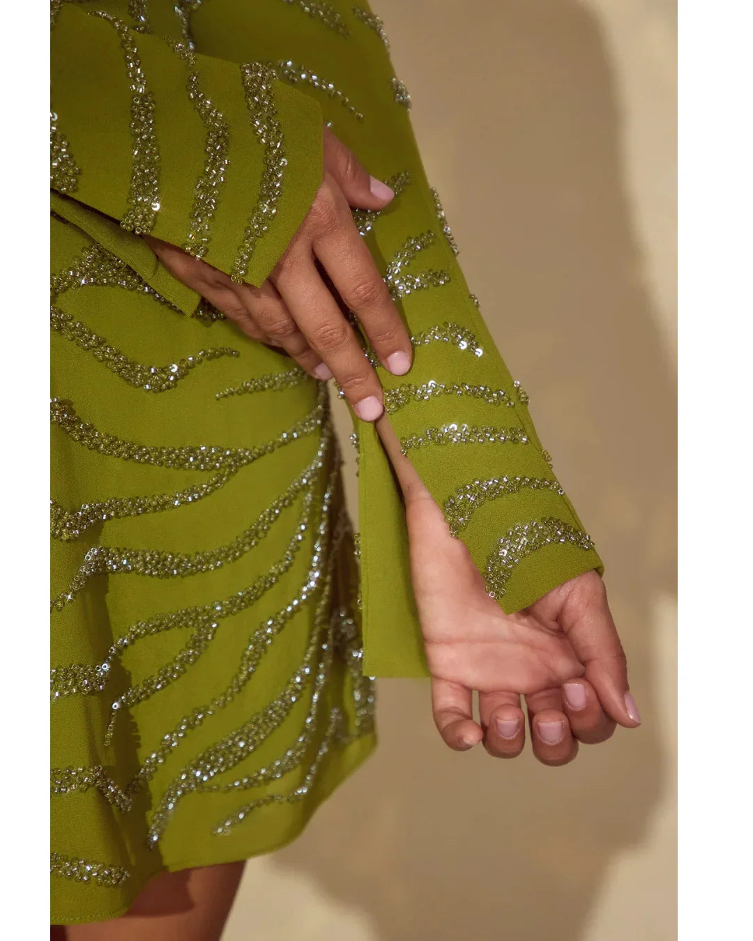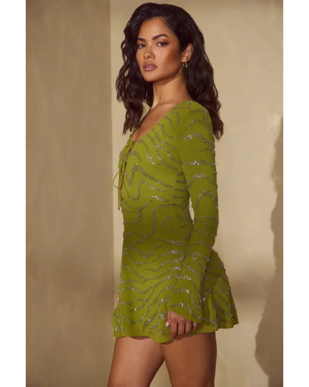 A timeless mini dress you'll wear forever, Estelle is a classic mini dress silhouette with understated sexy details that ensure the wearer exudes confidence. Cut from our premium georgette fabric in an a-line mini dress silhouette, the Estelle mini dress features zebra print beading that puts a grown up spin on animal print. The plunging neckline with sultry lace up front keep this long sleeve mini dress sexy and sensual making it the ultimate date night mini.