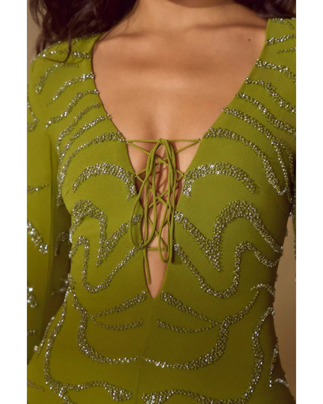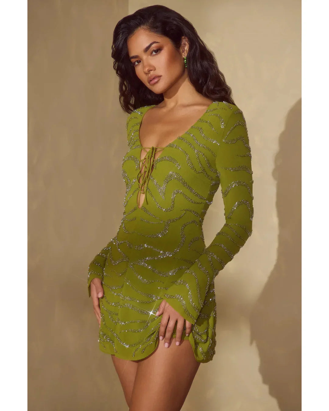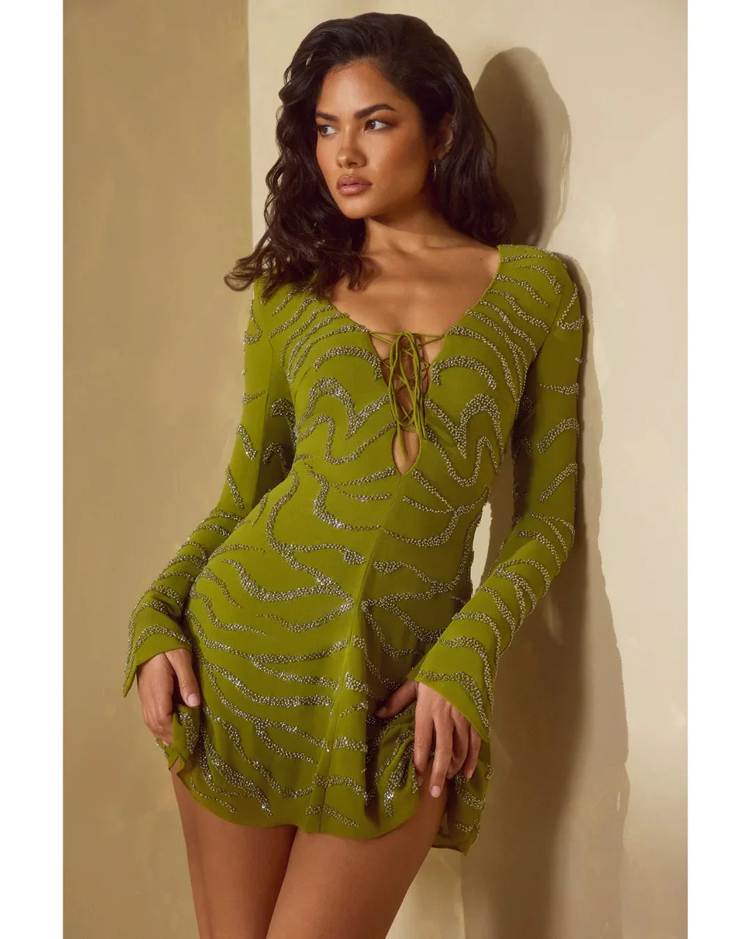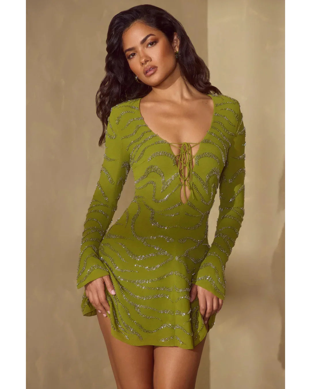 Estelle Long Sleeve Lace Up Mini Dress in Olive Green