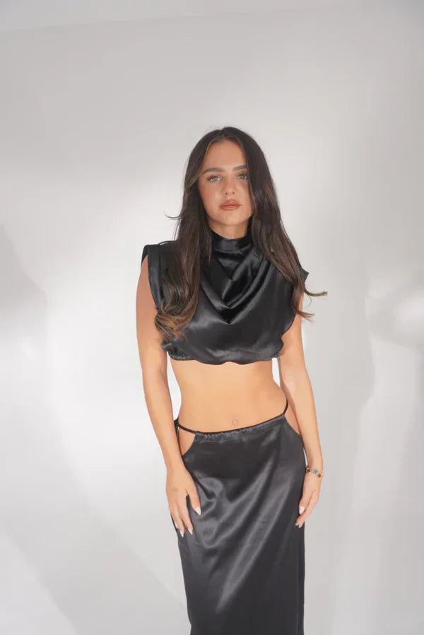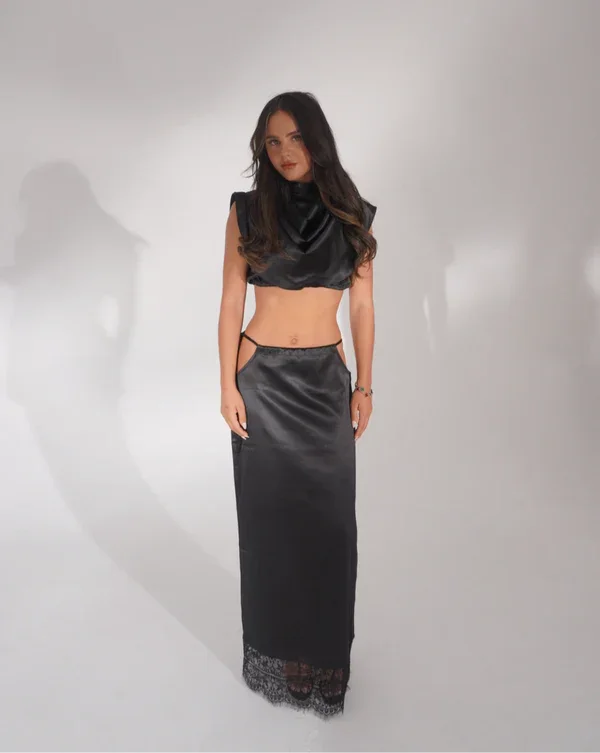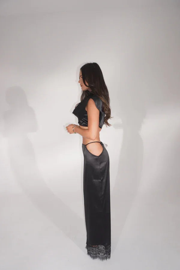 The co-ord of dreams! 'FAYE' this black satin two-piece features an adjustable tie-up at the waist skirt, cut-out hips, a thigh-to-floor leg slit and a delicate eyelash black edging.