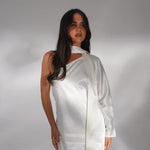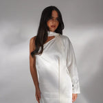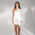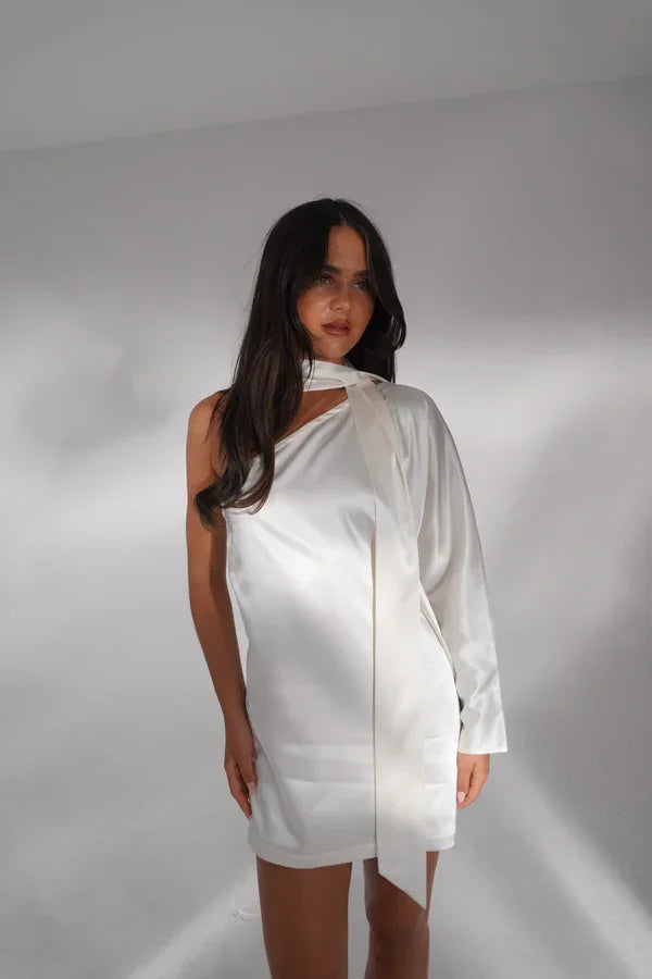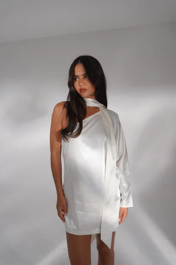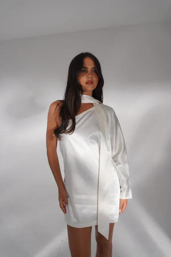 âFlorence' a classic one shoulder mini with asymmetric neckline and a matching necktie.
