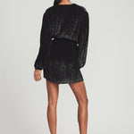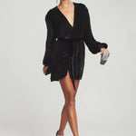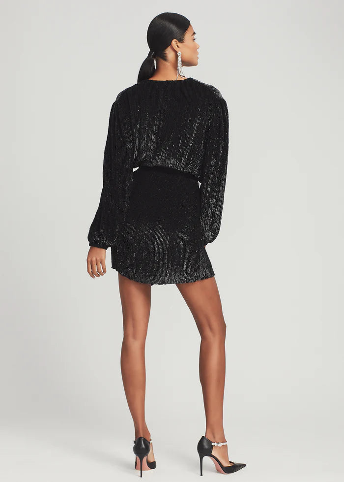Introducing the ultimate party frock: The Gabrielle Robe. Enveloped in hand-stitched sequin embellishments, this timeless silhouette features a wrap bodice, which is complemented by voluminous blouson sleeves and a velvet tie belt to cinch the waist. For a micro mini moment, we recommend sizing down. Shown here in Black.