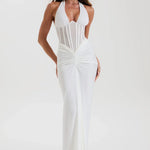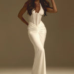 A sleek coordinated set featuring a structured plunge corset and matching mini skirt. The corset is designed with supportive underwire, mesh panels and contoured seams for a defined, flattering fit, finished with an adjustable halter tie. Paired with a smooth, body-skimming mini skirt with a clean, minimal silhouette, this set creates an effortless, elevated look.