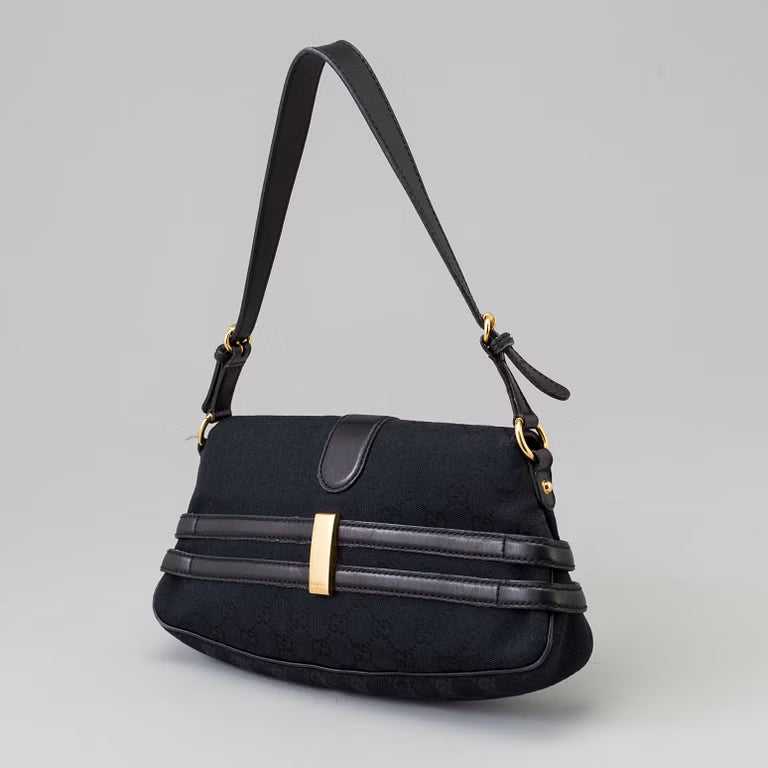 Monogram canvas with leather details. Gold-colored metal buckles. Adjustable shoulder strap. Fabric lining. Inner compartment with zipper.