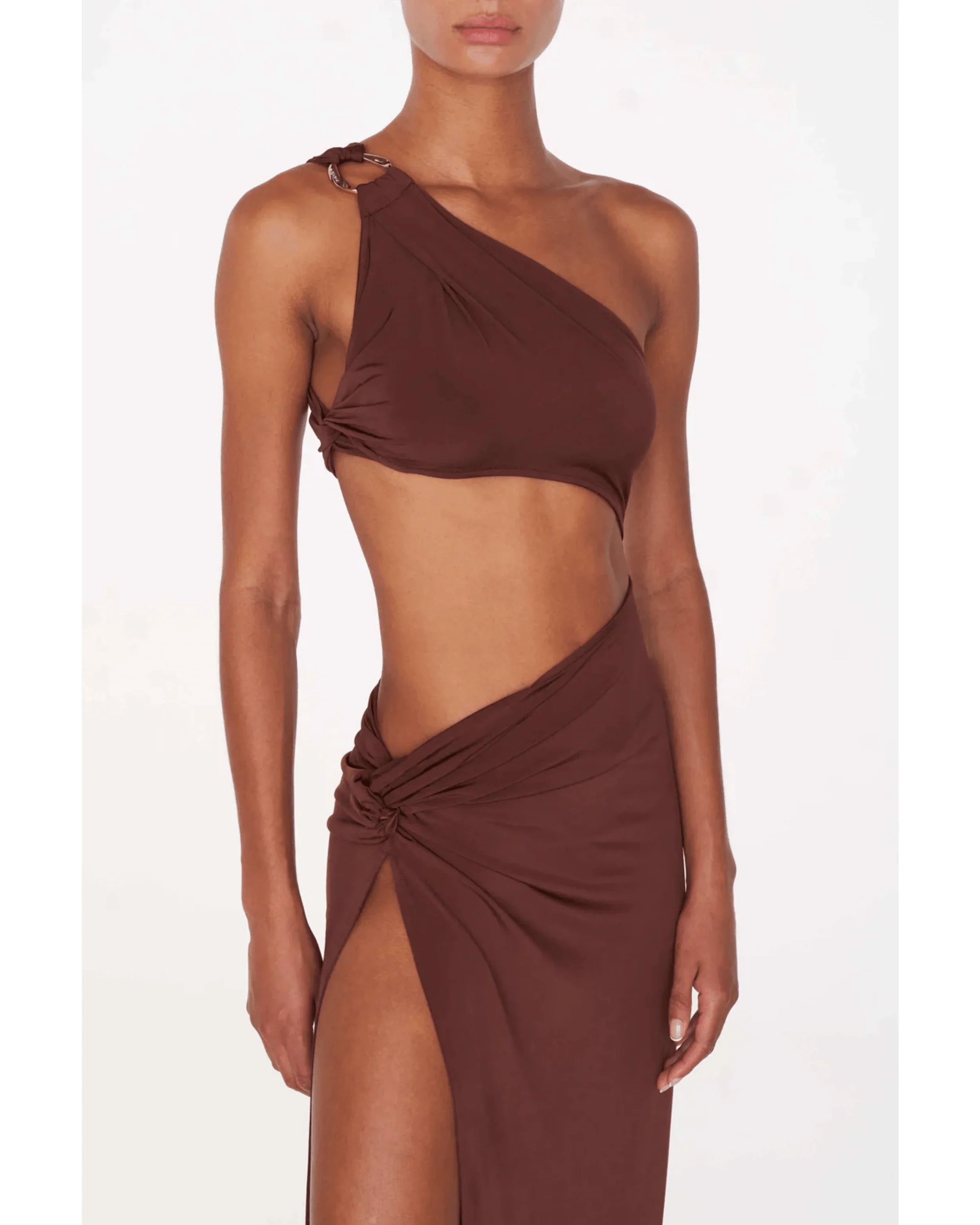 A figure-skimming, one-shoulder maxi dress in tiramisu jersey, Isamaya is a heady, super-sexy mix of daring cut-outs, hardware detailing and a thigh-high lit with knotted finish.