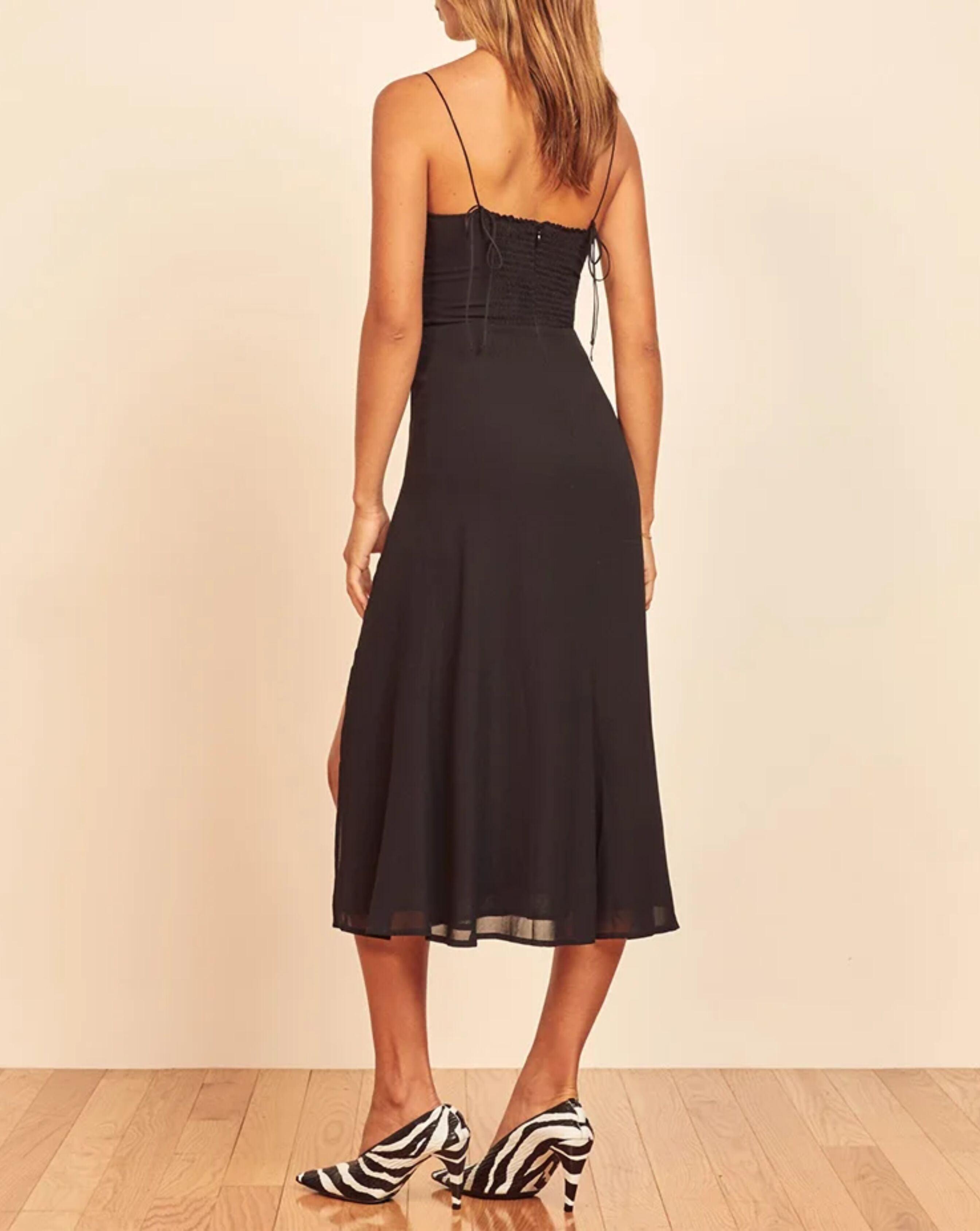 The Juliette, a sophisticated ensemble, showcases a sweetheart neckline gracing a corset-inspired bodice. Effortlessly cascading into a fluid skirt adorned with a daring sky-high slit, this event-ready piece is elegantly punctuated with slender spaghetti straps and a tastefully smocked back bodice.