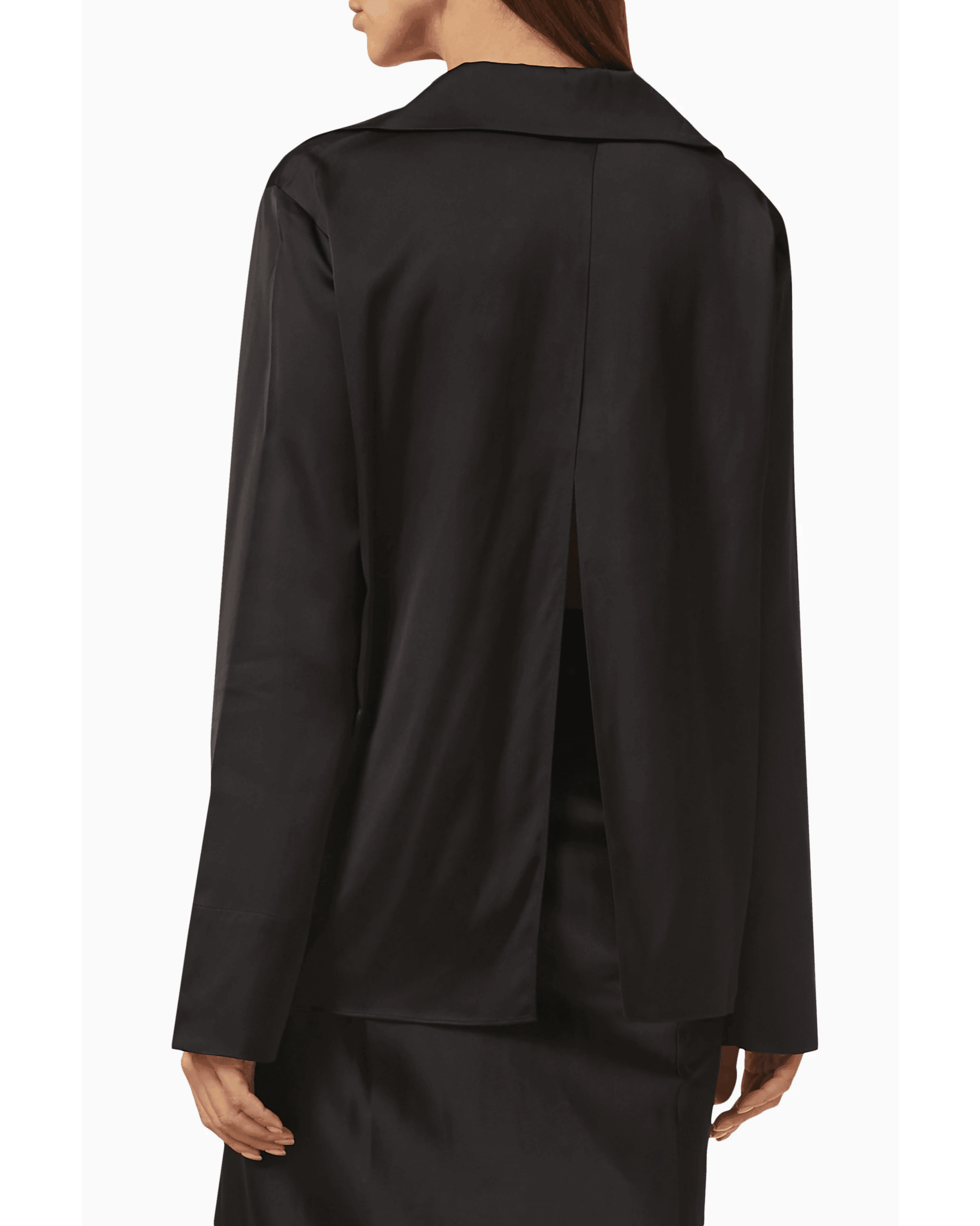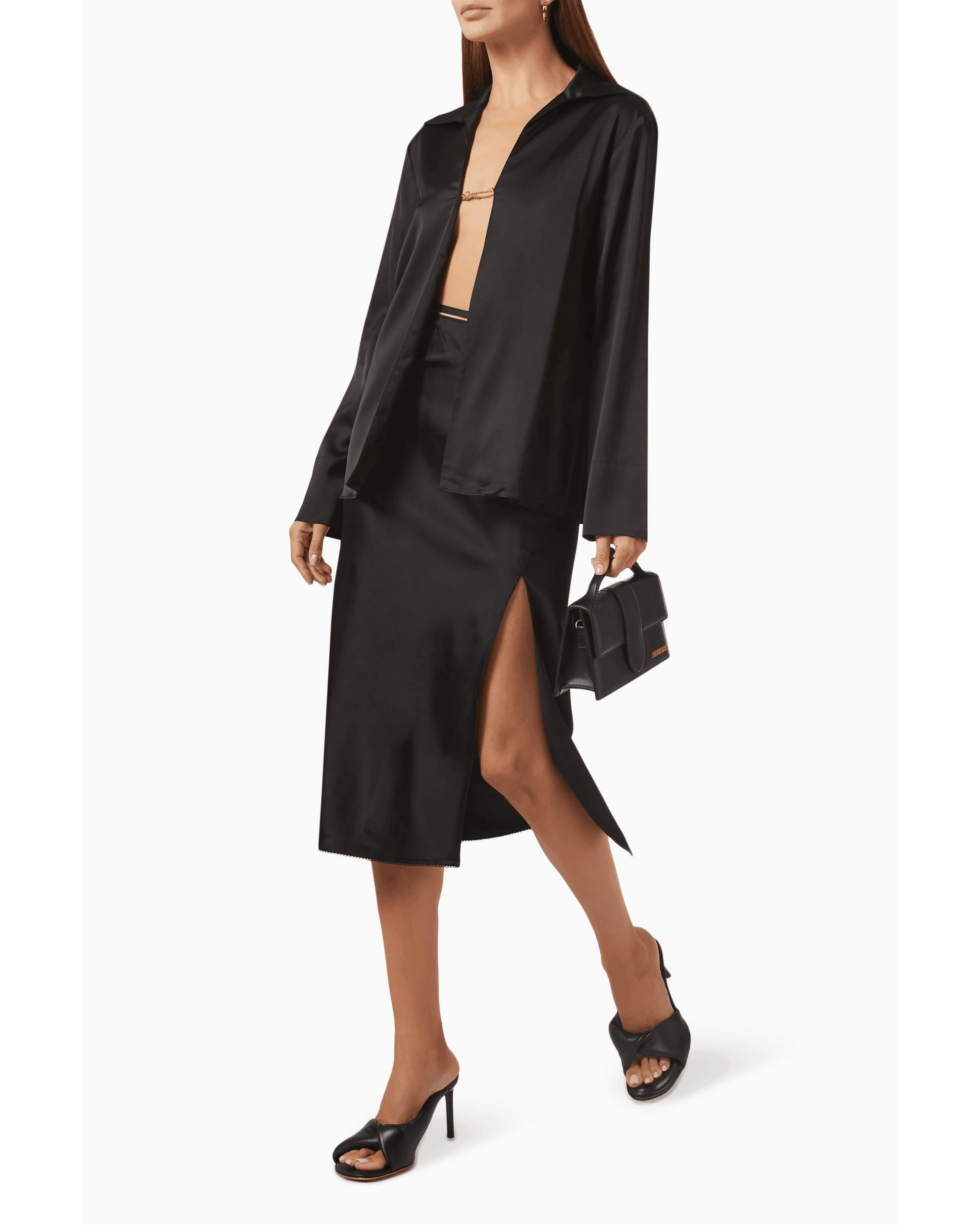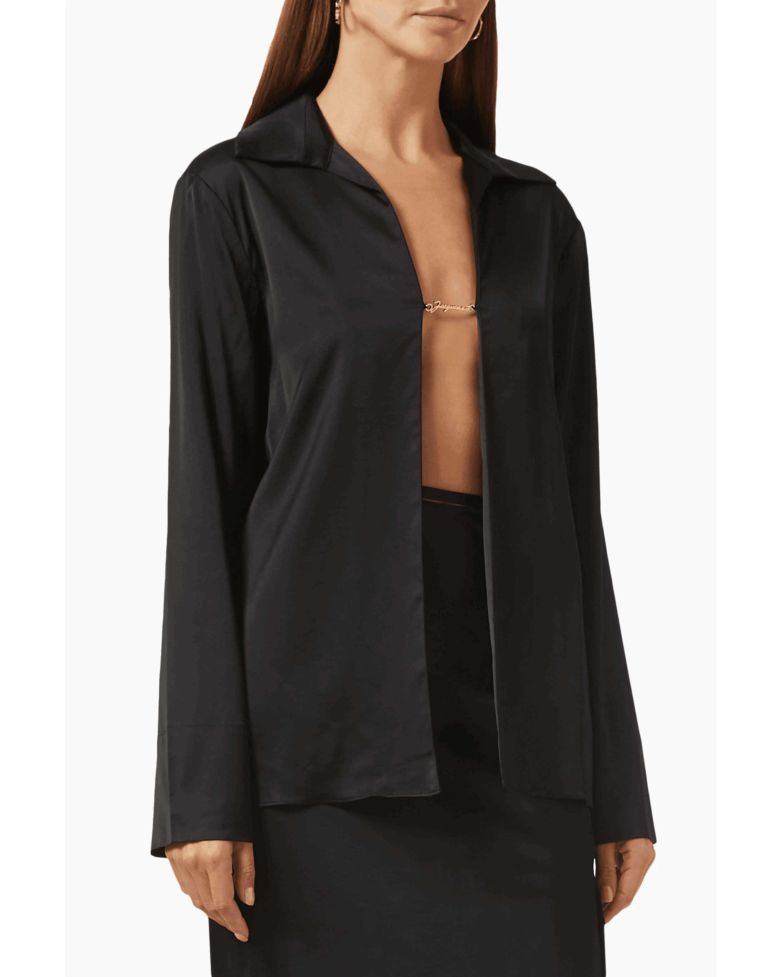 Innovative, minimalist design is synonymous with Jacquemus. From the new season collection, this tonal, satin-finish long-sleeve shirt is adorned with the brand's logo plaque at the front. Style with tailored pants, heeled mules and a top-handle bag.