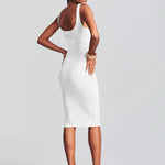 Show off your curves in our Laney Dress. This midi style features gold buttons carefully arranged down the front with coordinating pockets details. The dress is detailed with stitched lining. Shown here in White/Gold.