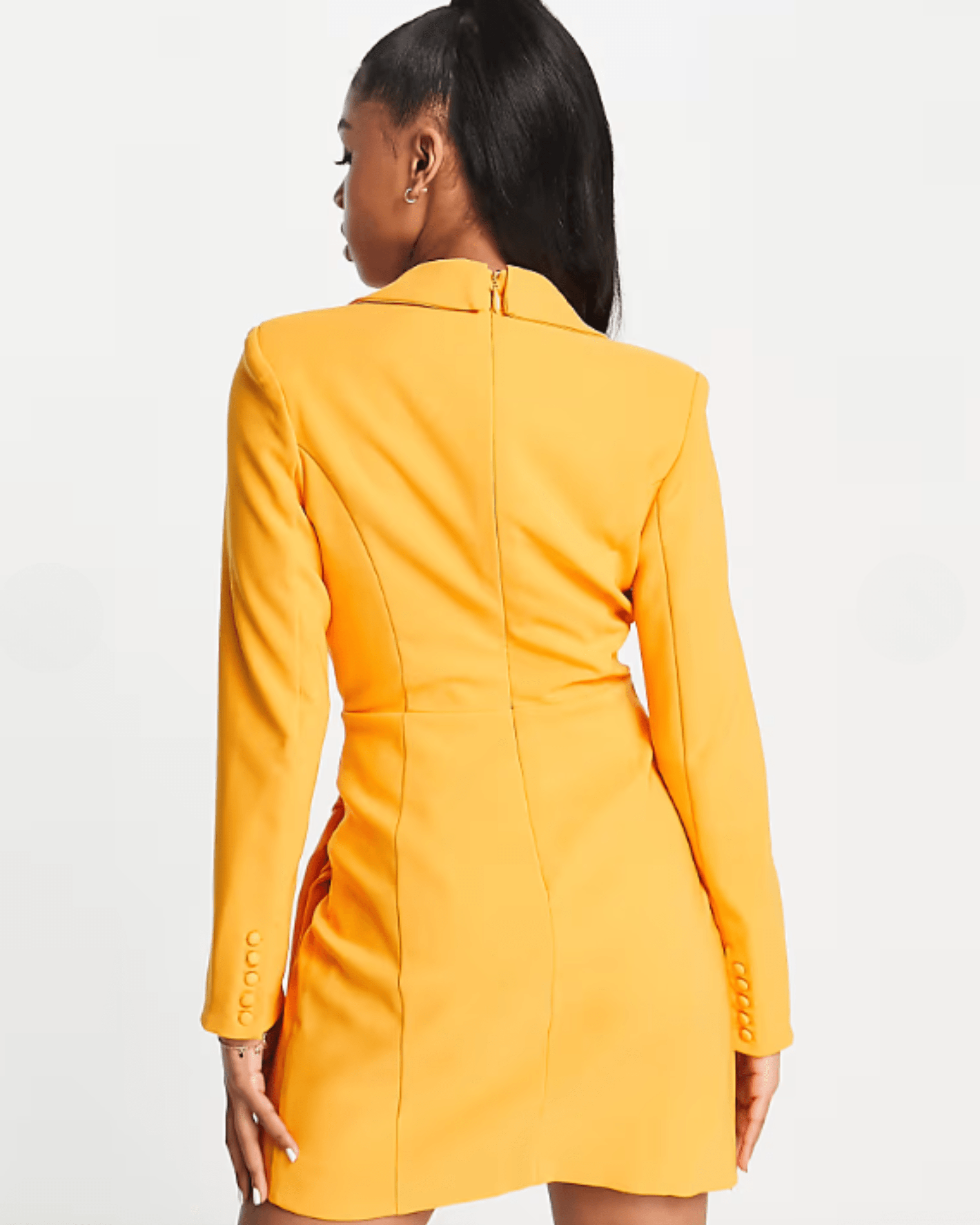 This dress combines a vibrant color with a chic blazer-inspired design, resulting in a fashionable and sophisticated piece that stands out in any setting.