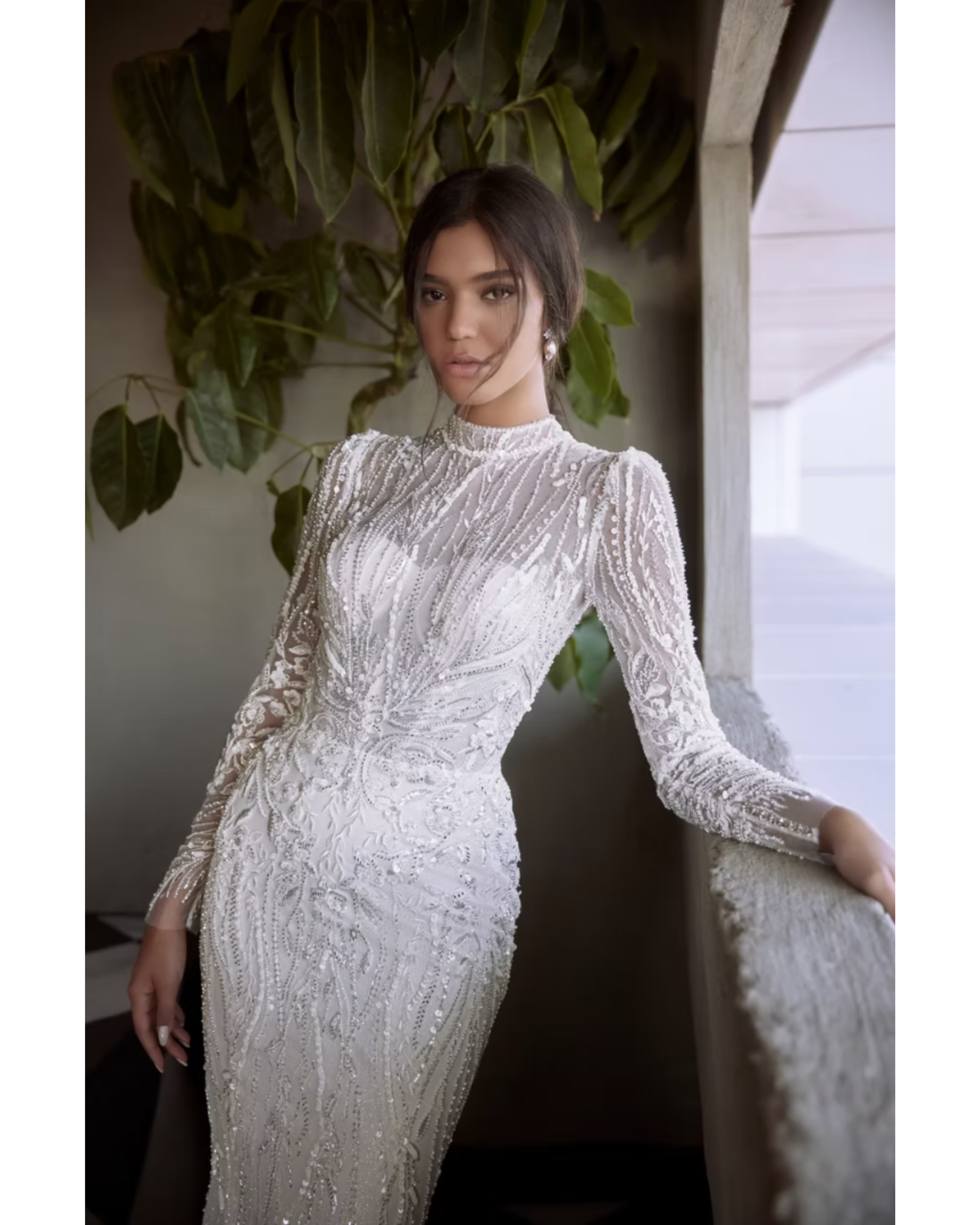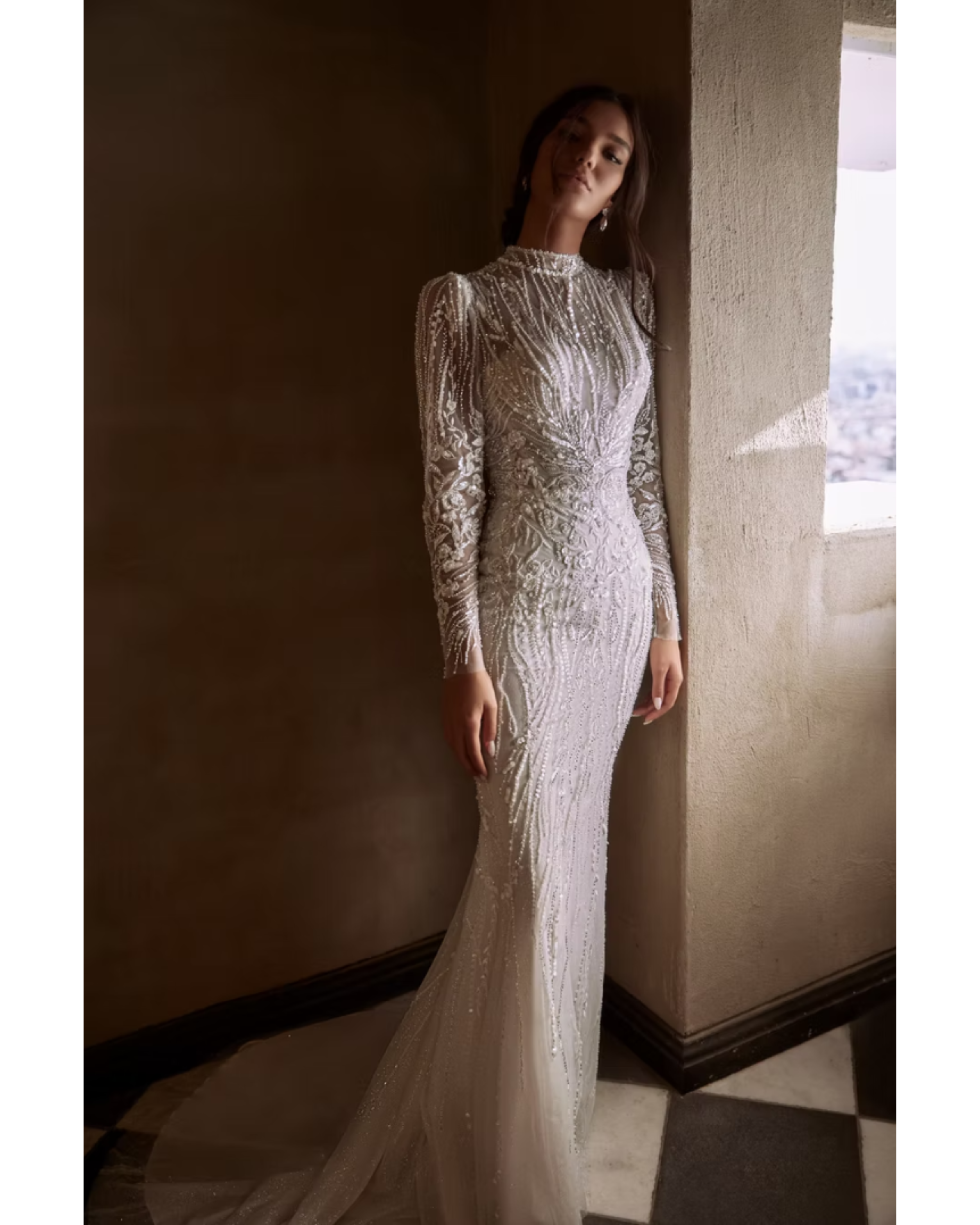 This item can be tried on by appointment only at the Ilume Bridal store in JLT. Please contact Ilume directly to arrange https://www.ilumebridal.ae/contact-us.