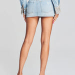 Dazzle in denim with our Lolita Embellished Denim Mini Skirt. This high-hemline mini features a classic five-pocket construction, zig-zag seam at center front, and crystal-embellished waist. Light distressing throughout. Shown here in Light Wash Denim.