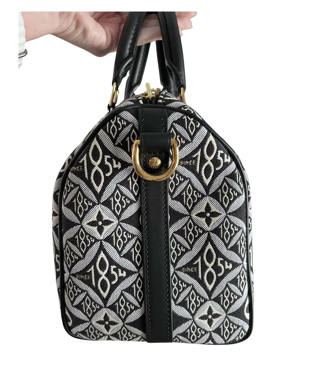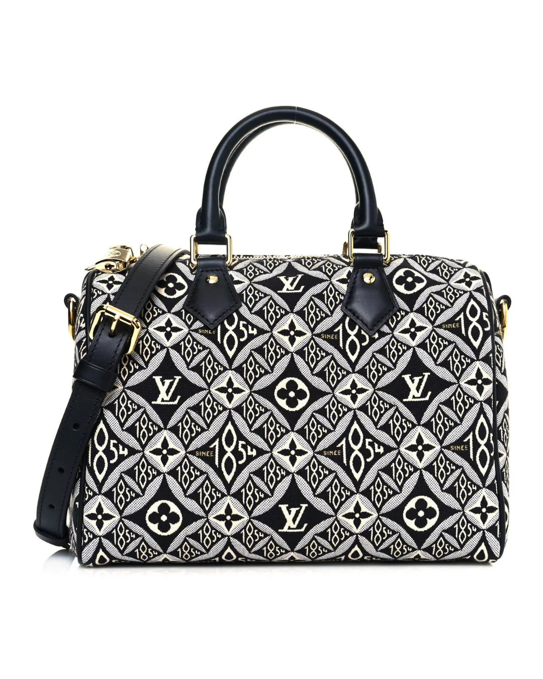 This is the Louis Vuitton Since 1854 Speedy Bandouliere 25 handbag, featuring the brand's iconic monogram in a jacquard textile pattern. The design showcases a refined black and white color palette with a repeated motif that blends the LV initials, fleur-de-lis, and "1854" the year Louis Vuitton was founded all woven into the fabric. The bag includes black leather trim, gold-tone hardware, dual rolled leather handles, and a top zip closure with a signature LV padlock. Timeless yet modern, this piece reflects the heritage and elegance of the Louis Vuitton Maison.