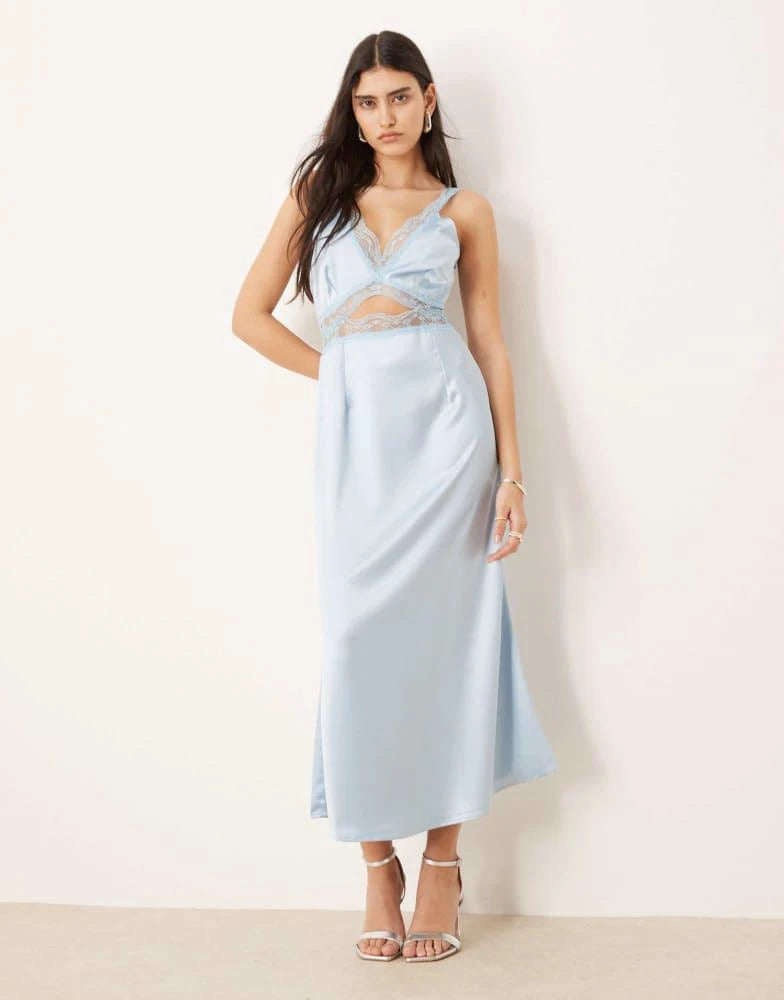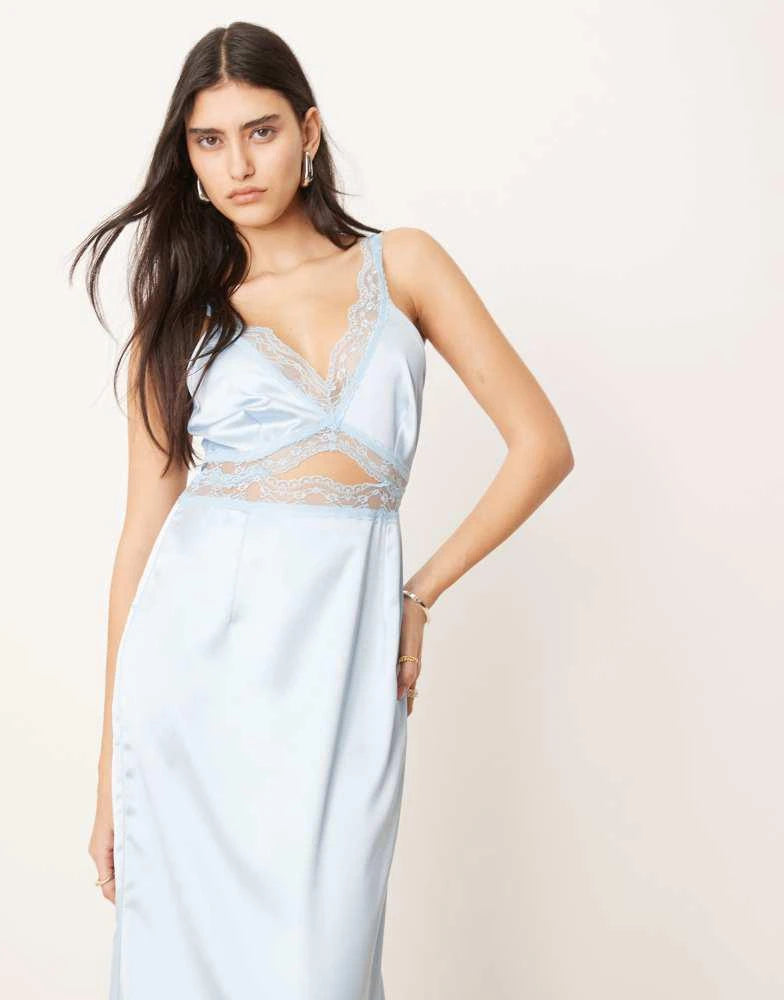 Featuring a flattering slip silhouette, it is detailed with delicate lace trims and subtle cut-out accents that add a modern, feminine edge. The midaxi length creates a graceful flow, while the soft, lightweight fabric drapes beautifully over the body for an effortlessly refined fit.