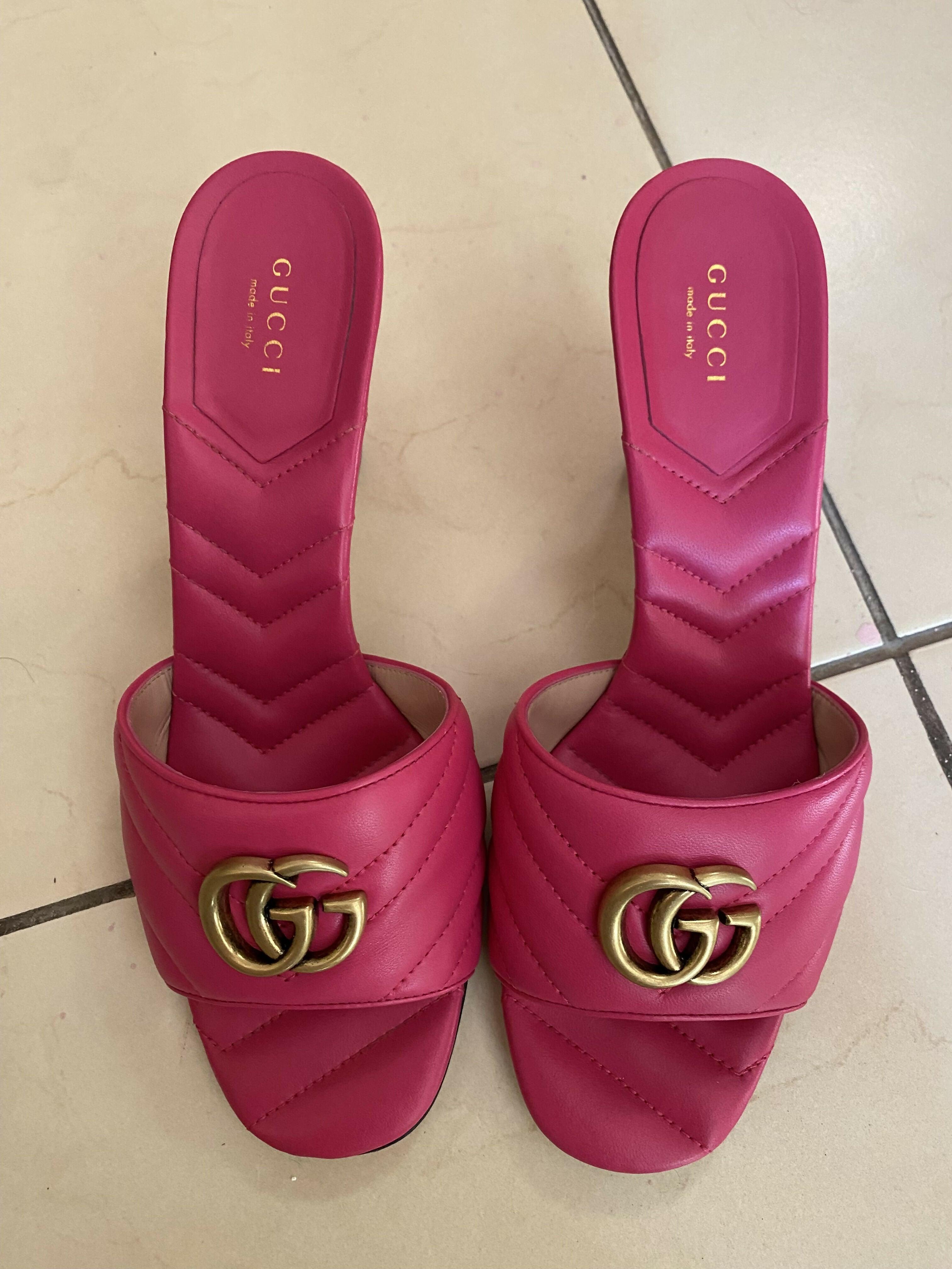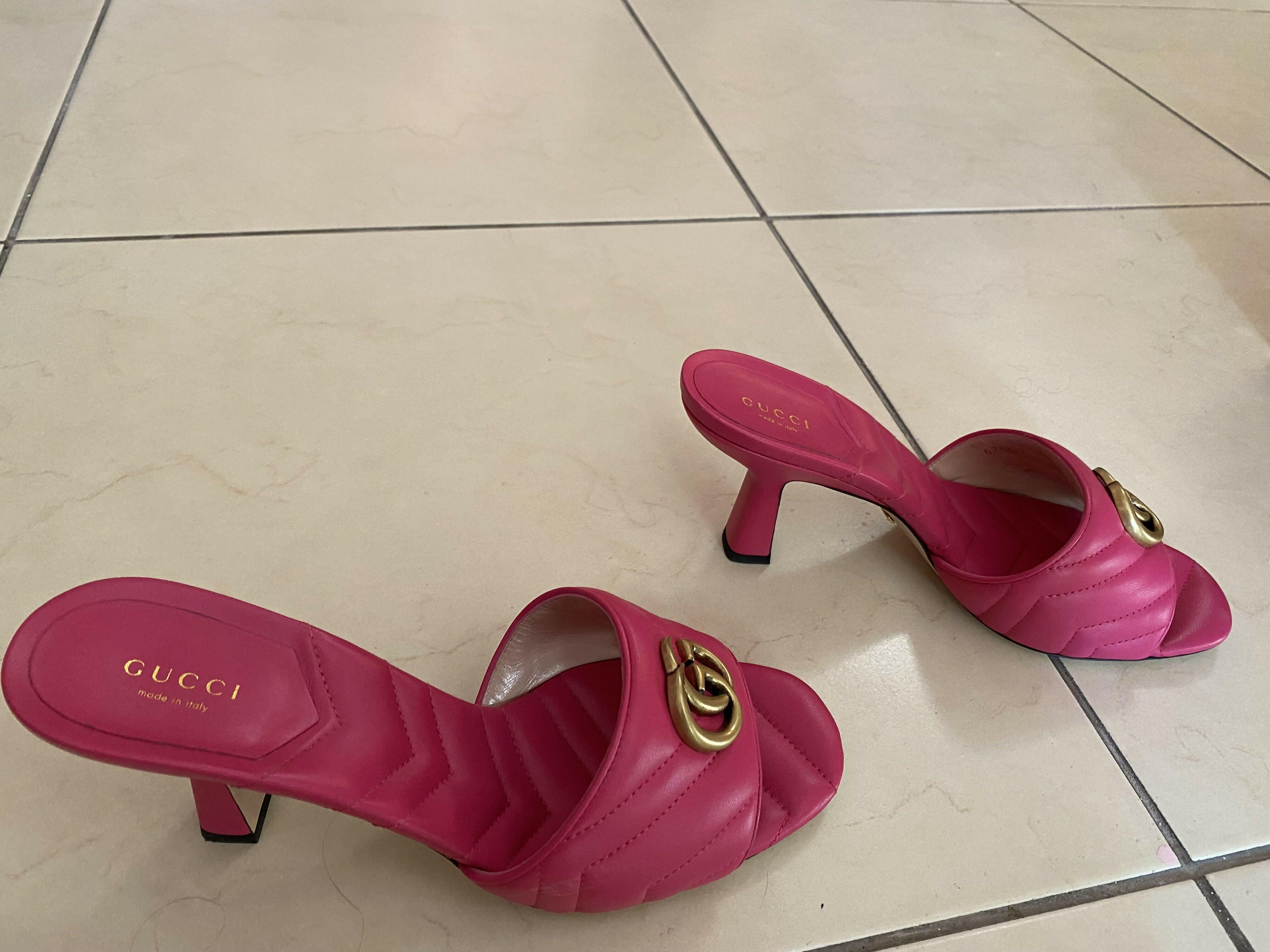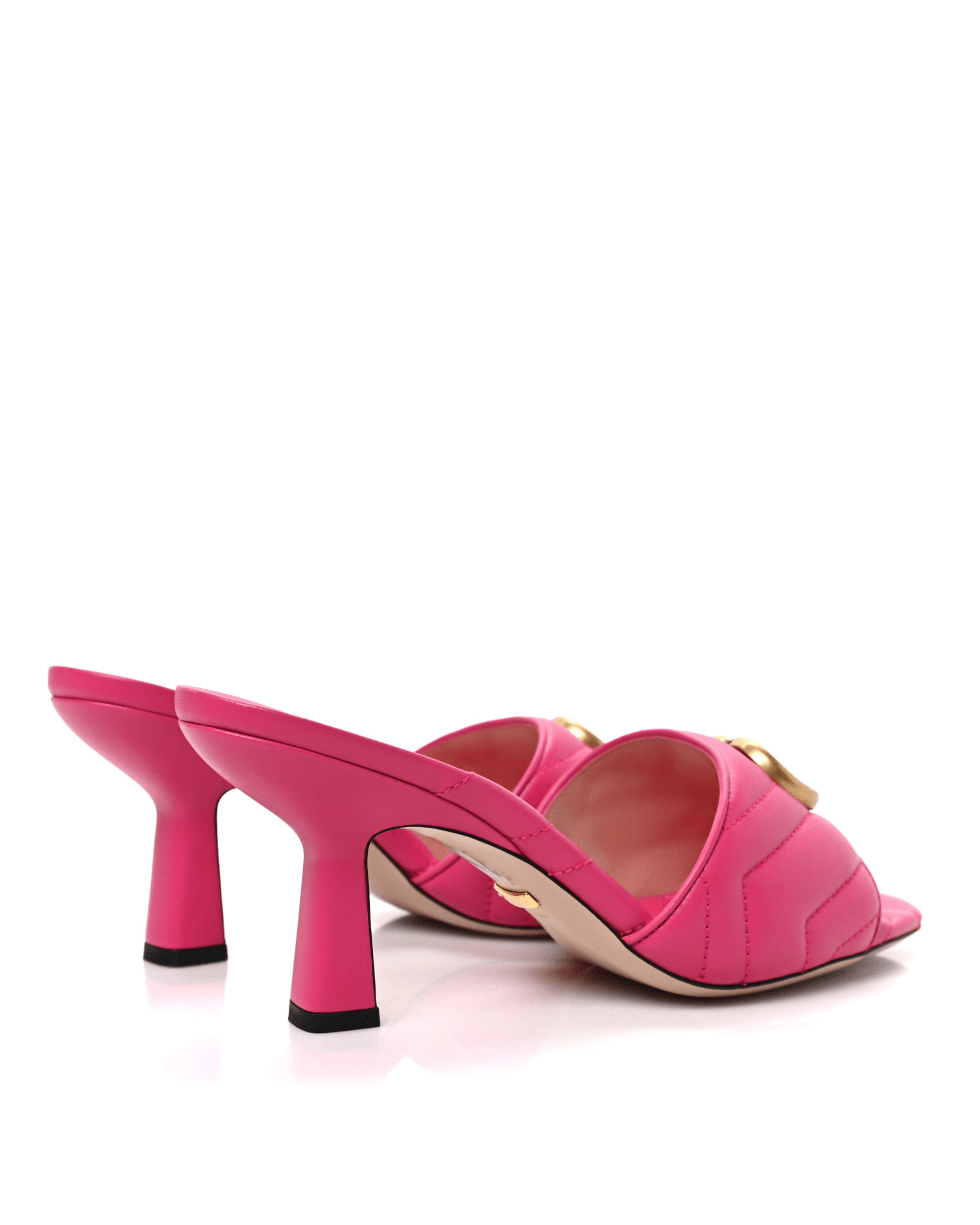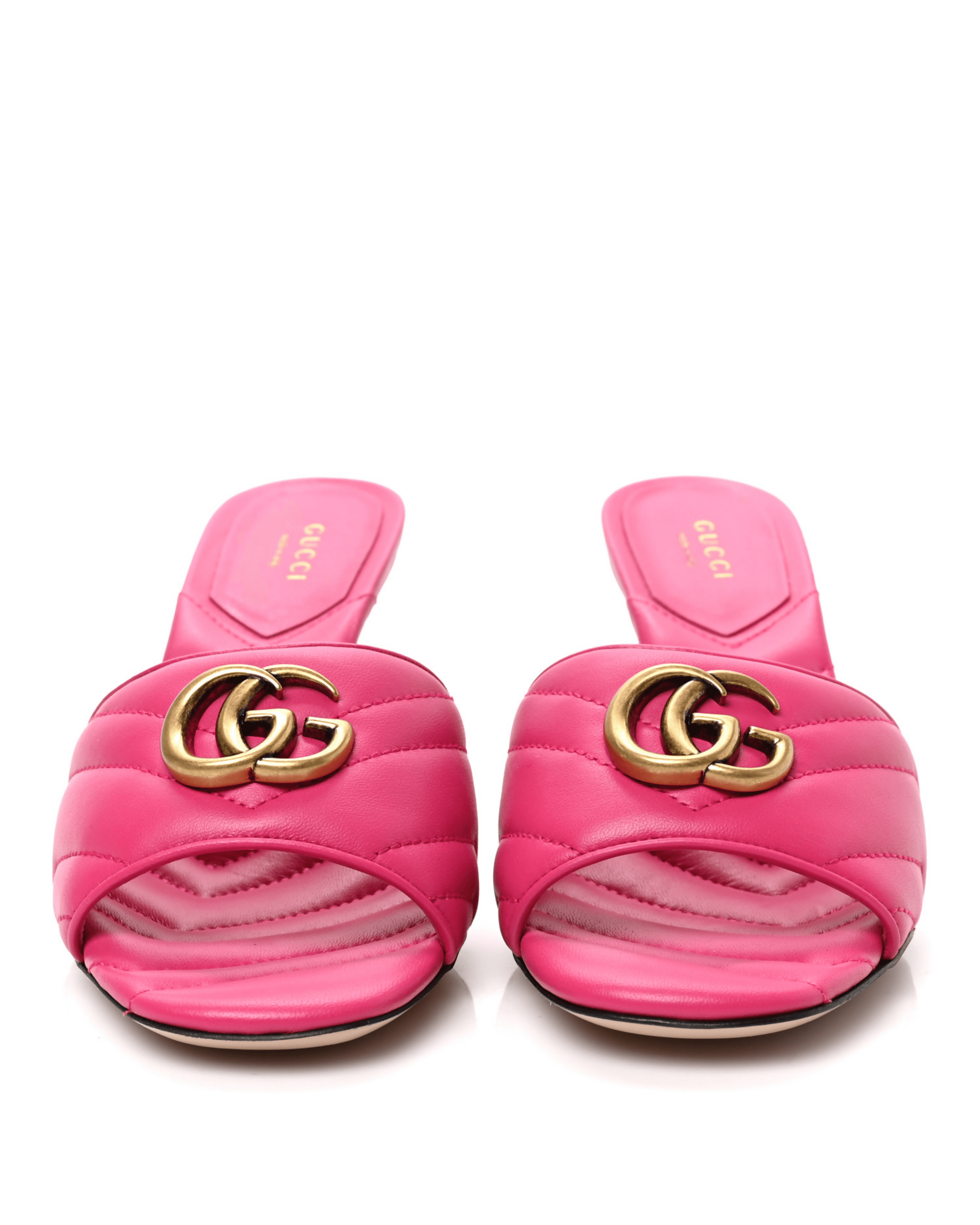 This is an authentic pair of GUCCI Nappa Matelasse GG Marmont 75mm Slide Sandals. These heels are crafted of leather in pink. They feature an antique gold GG logo, a peep toe