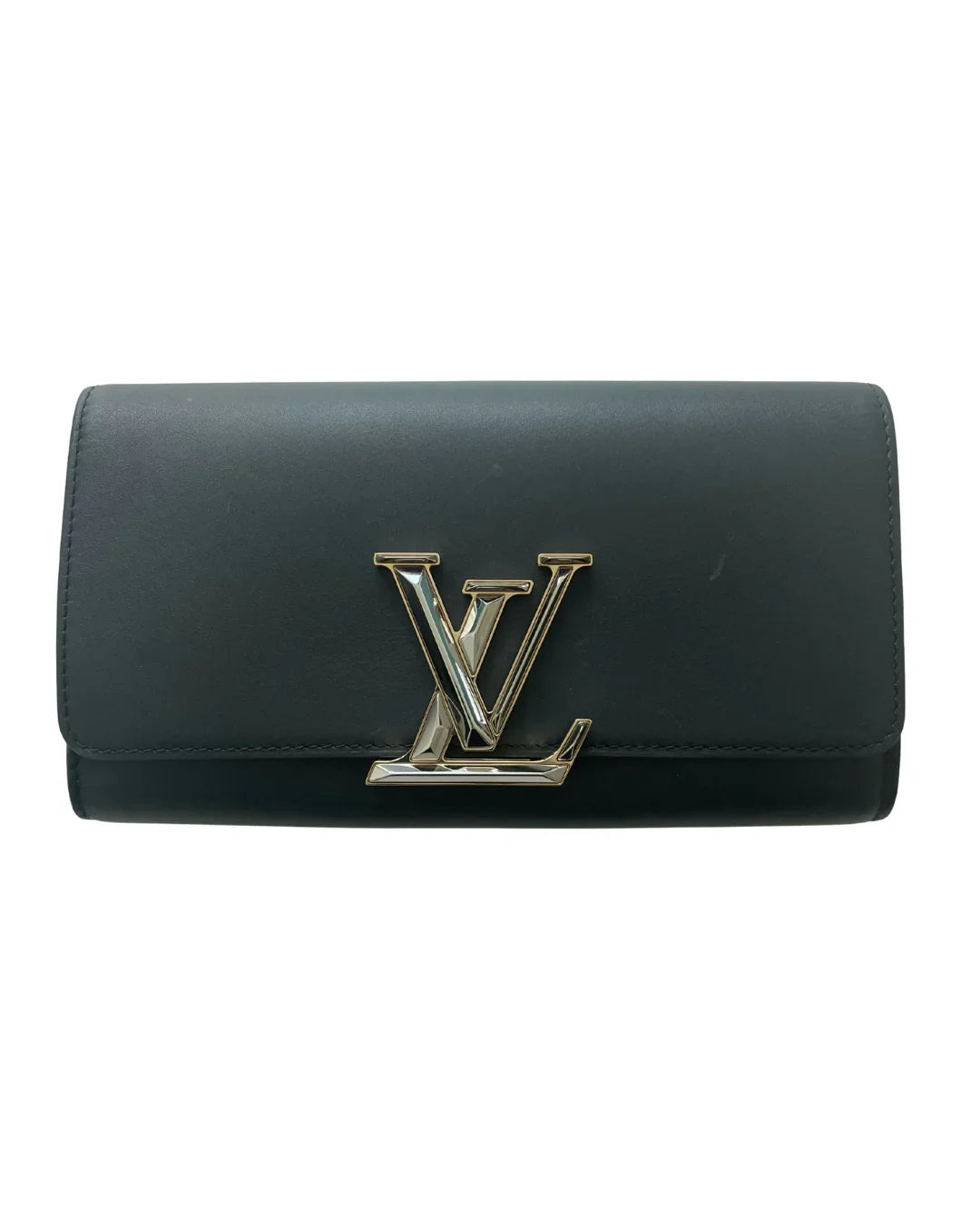 Elegance meets timeless luxury in the Louis Vuitton Pochette Louise. Crafted from smooth black leather, this sleek evening clutch features the iconic LV initials in a polished, gold-tone metal as the central focal point. The structured silhouette and refined flap closure make it a sophisticated choice for formal occasions or elevated everyday wear. With a compact yet practical interior, it offers enough space for essentials while maintaining an effortlessly chic appearance.