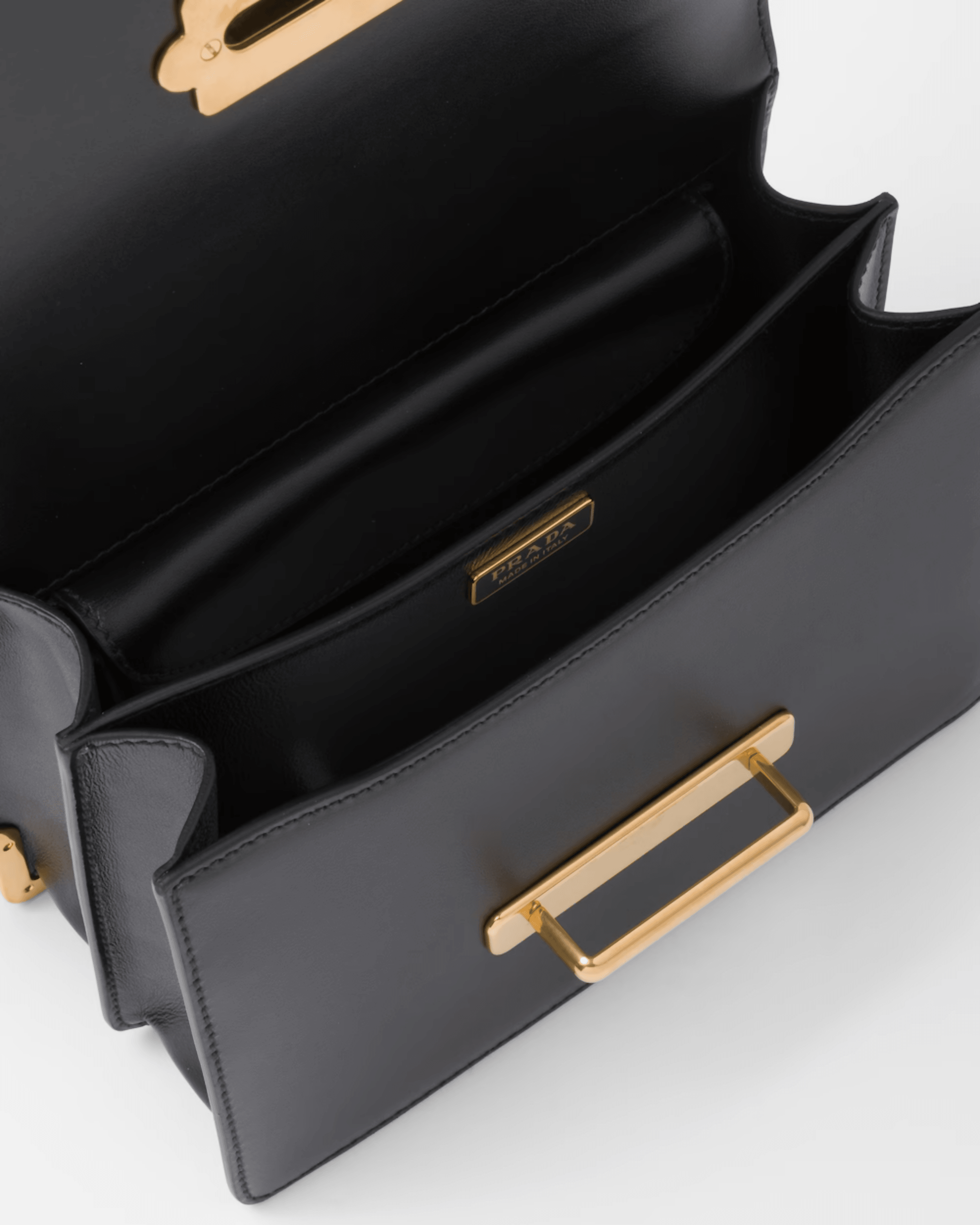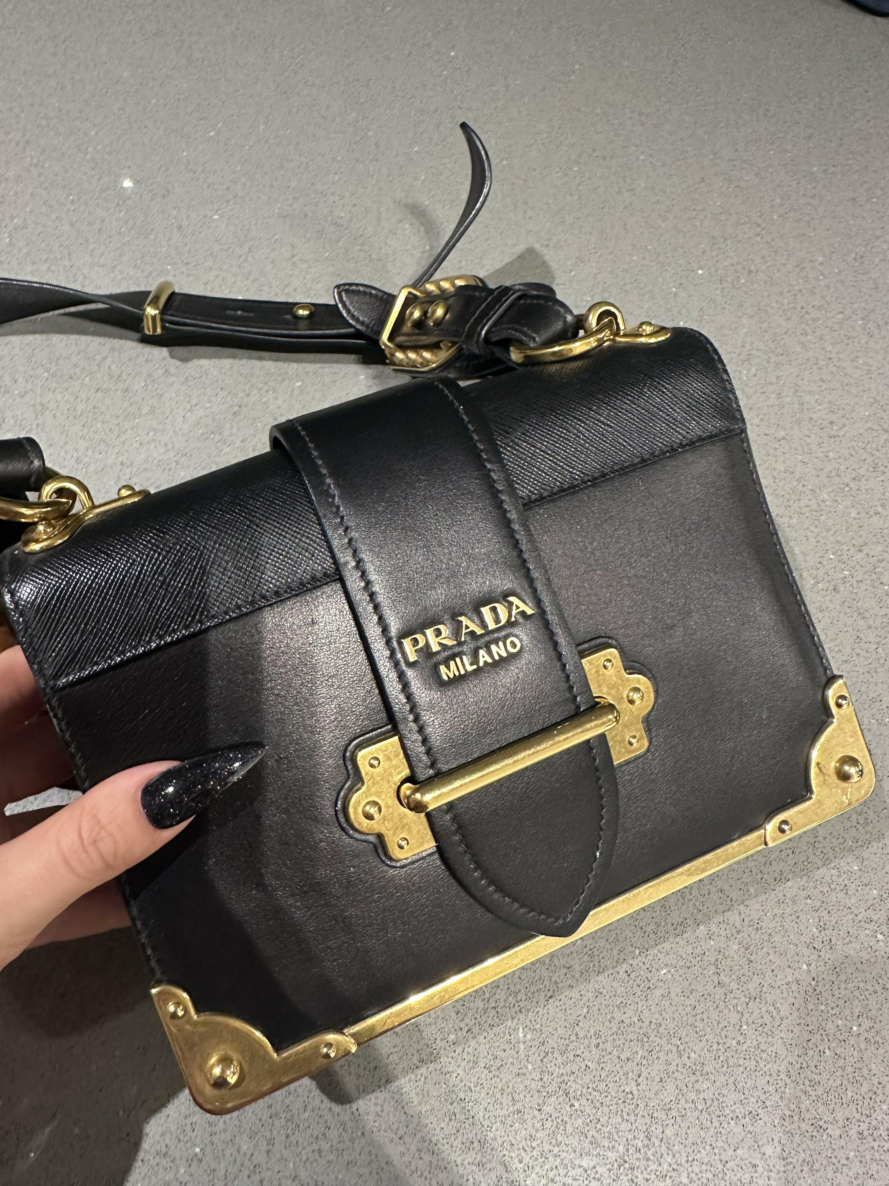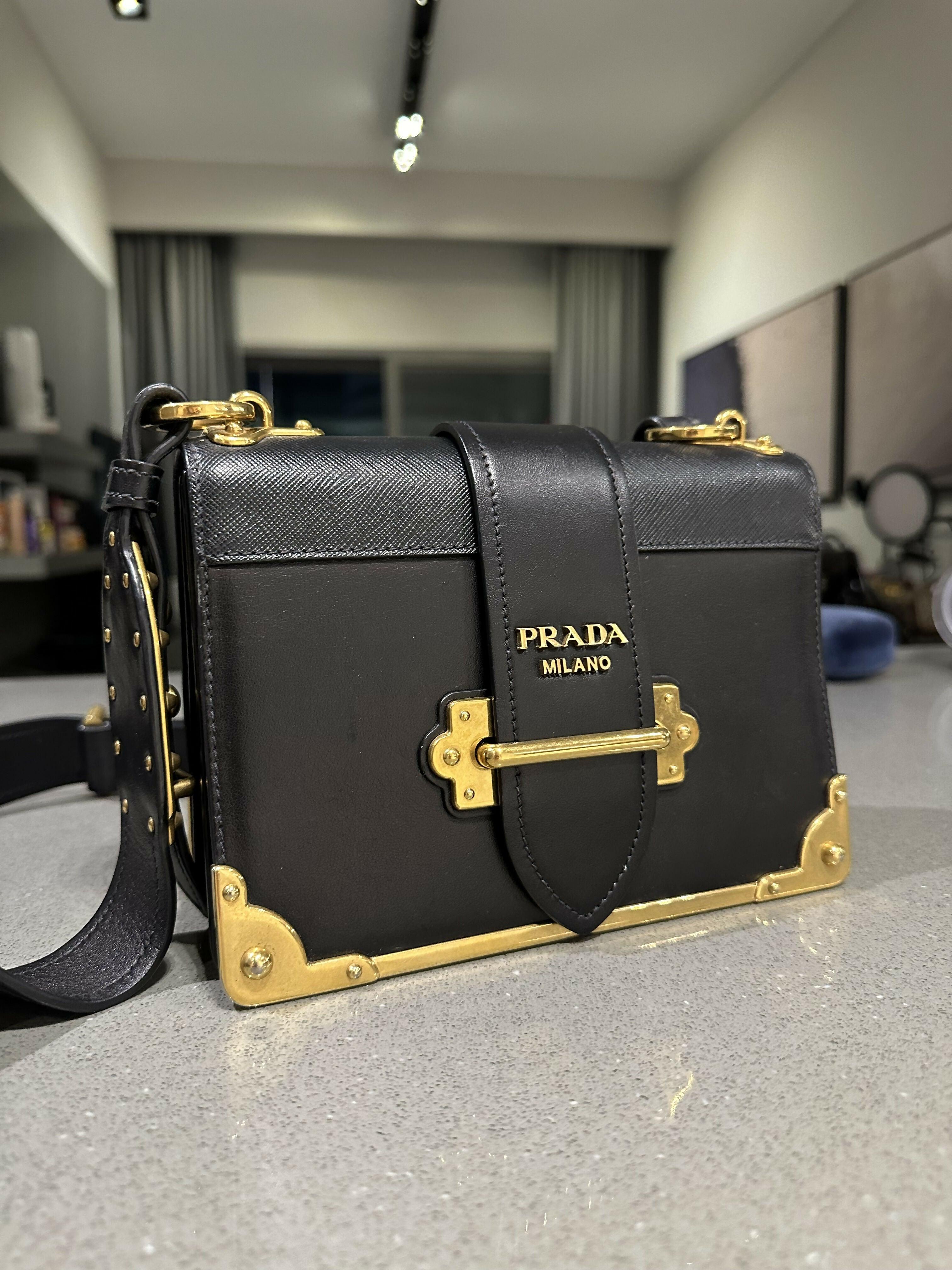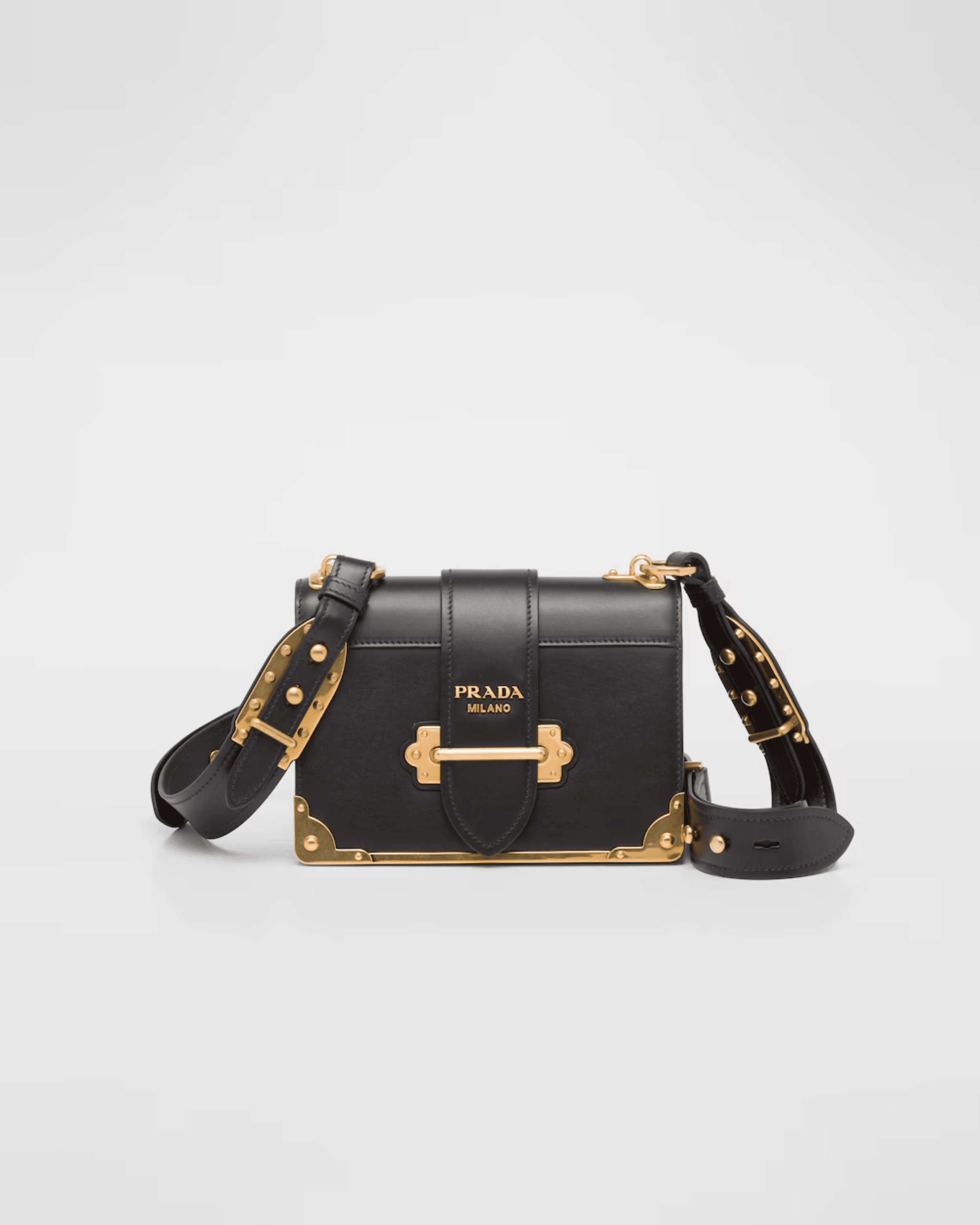 Inspired by the allure of precious and ancient volumes, the Prada Cahier bag is part of Prada's iconic lines and is presented here in a sophisticated monochrome version with a new color story composed of neutral shades. Featuring antiqued gold-tone hardware that recalls the bindings on books from past eras, the accessory has an adjustable leather shoulder strap so it can be worn in different ways.
