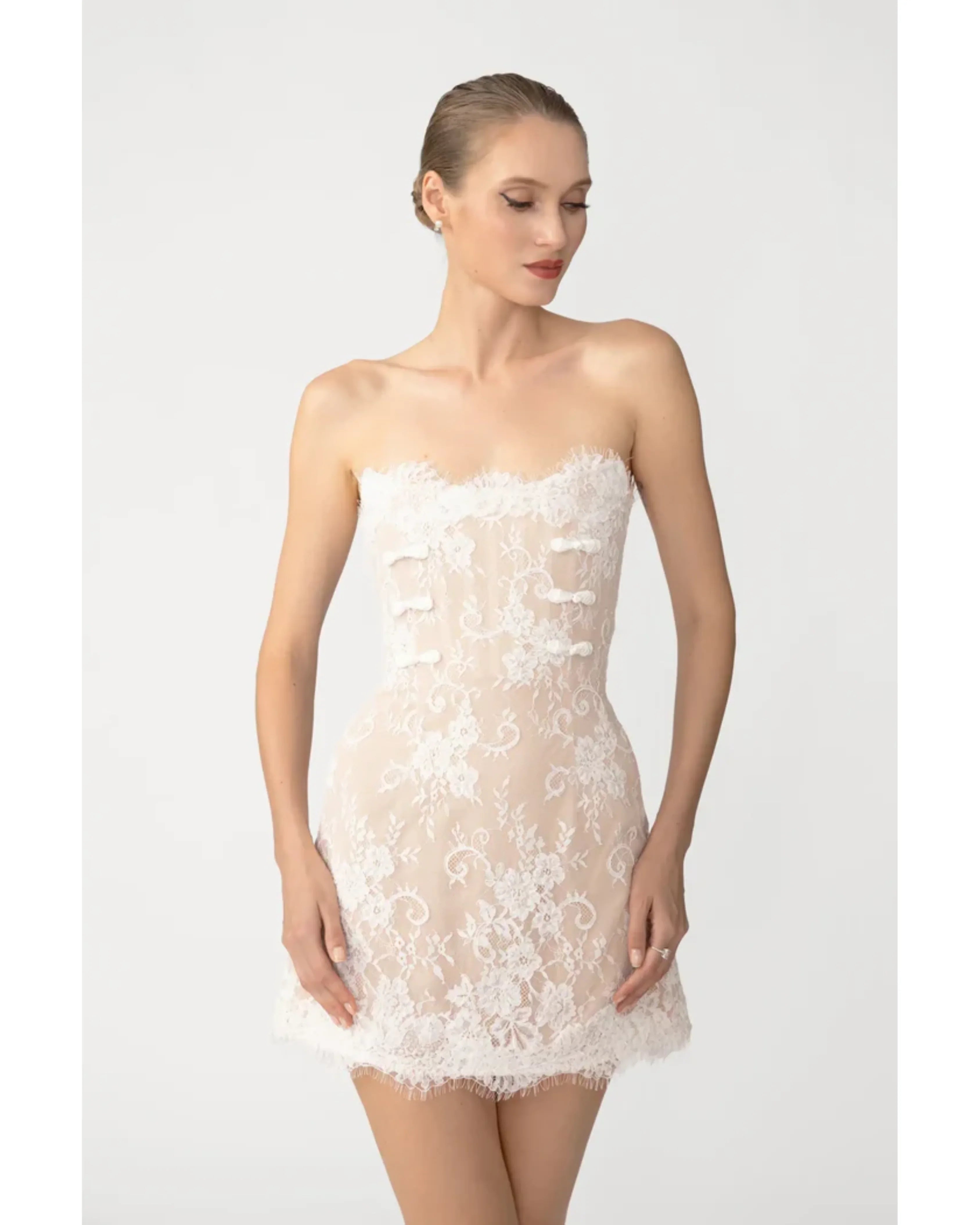 Strapless lace mini dress with fully-boned bodice featuring signature hand-tied pipa knot detail.