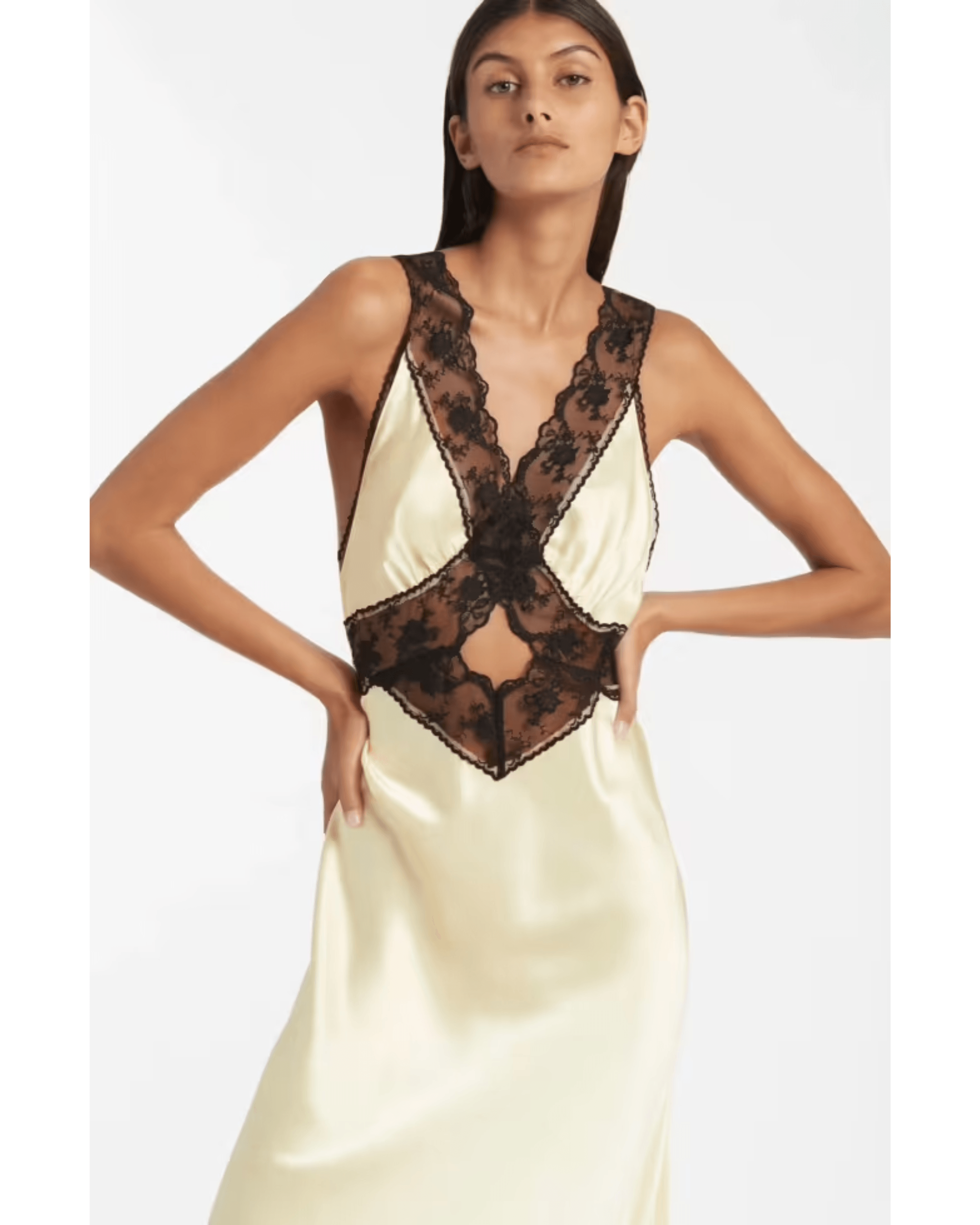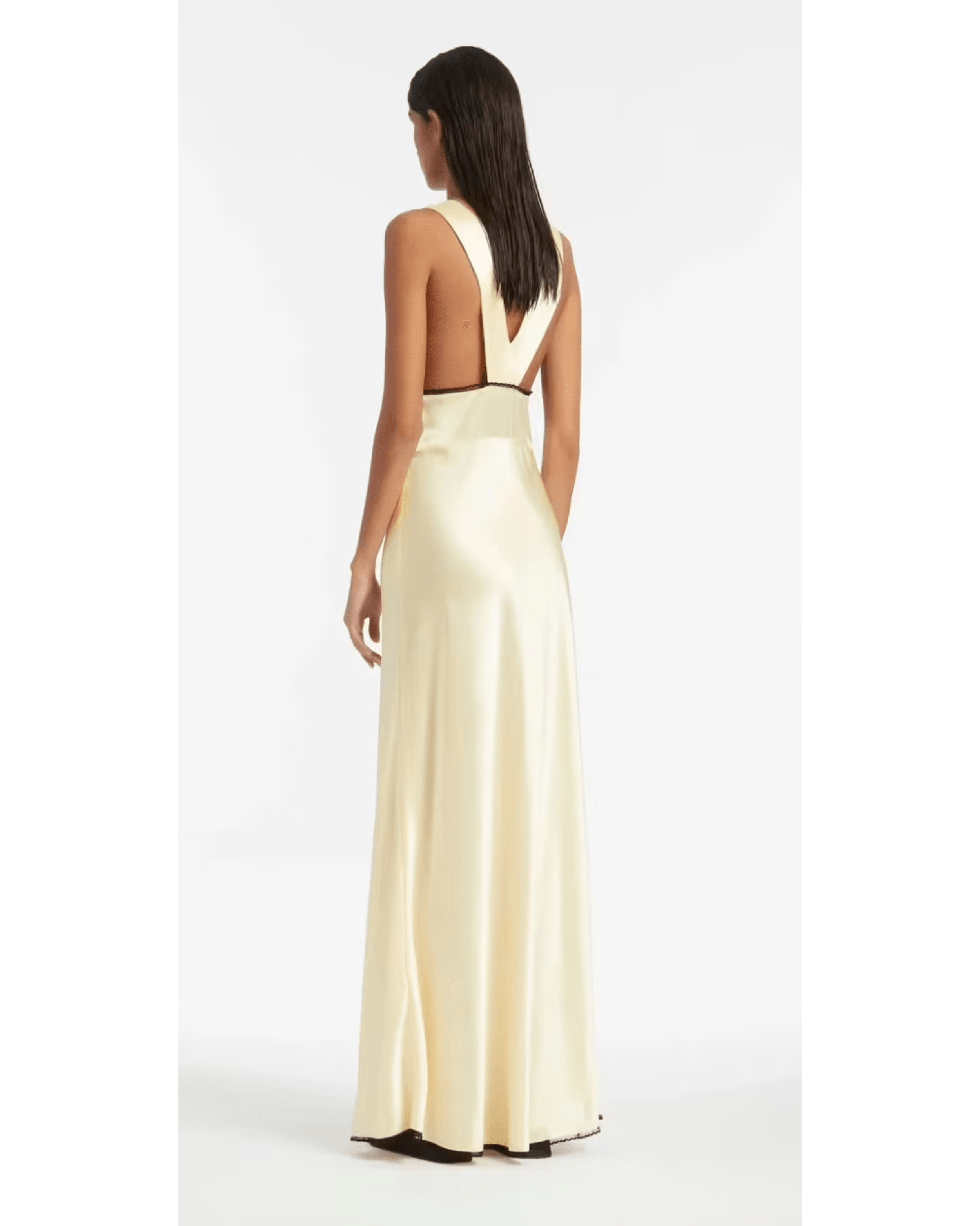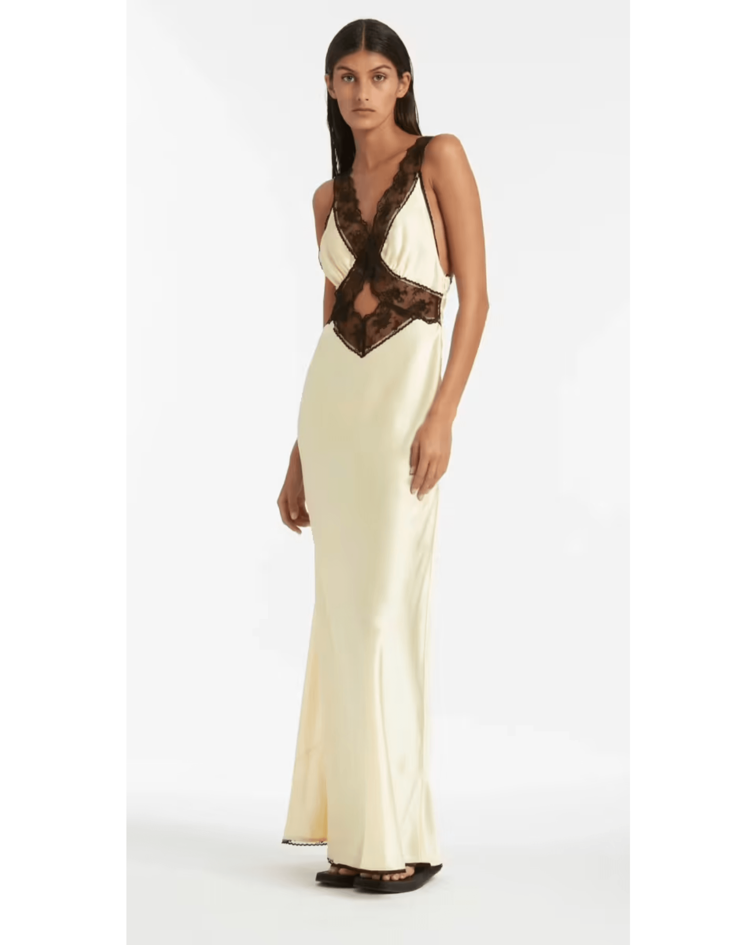 A lemon maxi dress featuring contrast floral lace cut-out detail through front to accentuate the waist. Bias cut silk satin softly skims the body.