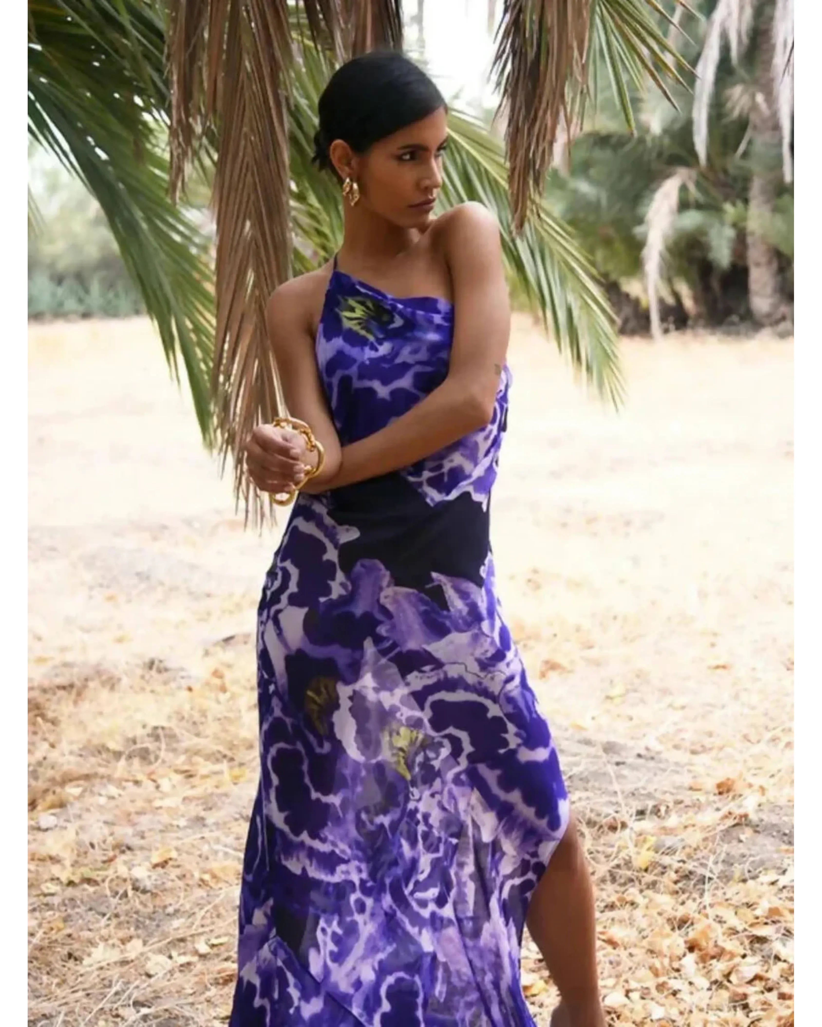 Simple, sexy and ready to make a statement...introducing Simonetta. A flawless one-shoulder maxi dress conjured in a bold, purple orchid print. With a slinky, streamlined silhouette, side split detail and our signature cowl back, she's the epitome of printed perfection.