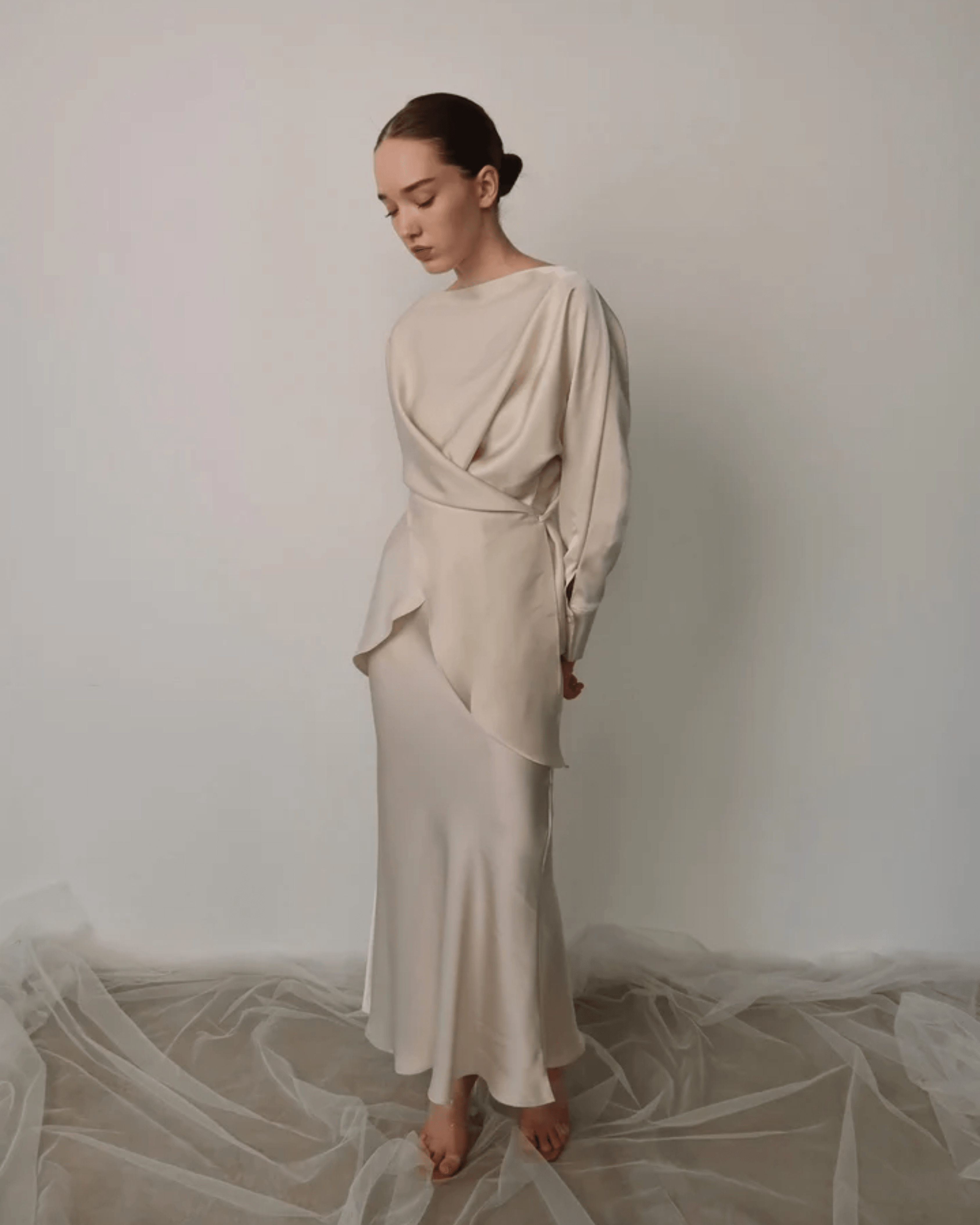 Introducing the Tessa Co-ord Set: a luxurious ensemble that exudes a modern sophistication. The set features a top with elegant balloon sleeves and a subtle wrap detail that cinches at the waist, paired with a sleek, flowing skirt that skims the floor with grace. This stunning duo is a testament to timeless style and contemporary design, ideal for any upscale occasion or when you desire to feel your most polished and poised.
