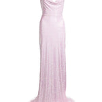 The Agora Glitter Dress is designed for elevated eveningwear, featuring a refined floor-length silhouette that drapes beautifully across the body. Crafted with a soft cowl neckline and a form-fitting shape, it highlights the natural contours with understated glamour. A feathered hem adds movement and texture, while the deep open back introduces a sophisticated, dramatic finish.