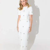 Adorned with delicately placed clusters of crystal embellishments on a simple yet chic tee, it beautifully combines understated charm with a hint of sparkle. Pair it with the matching skirt for a picture-perfect bridesmaid look that's timeless and effortlessly graceful.