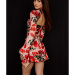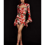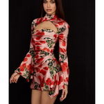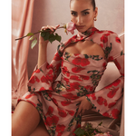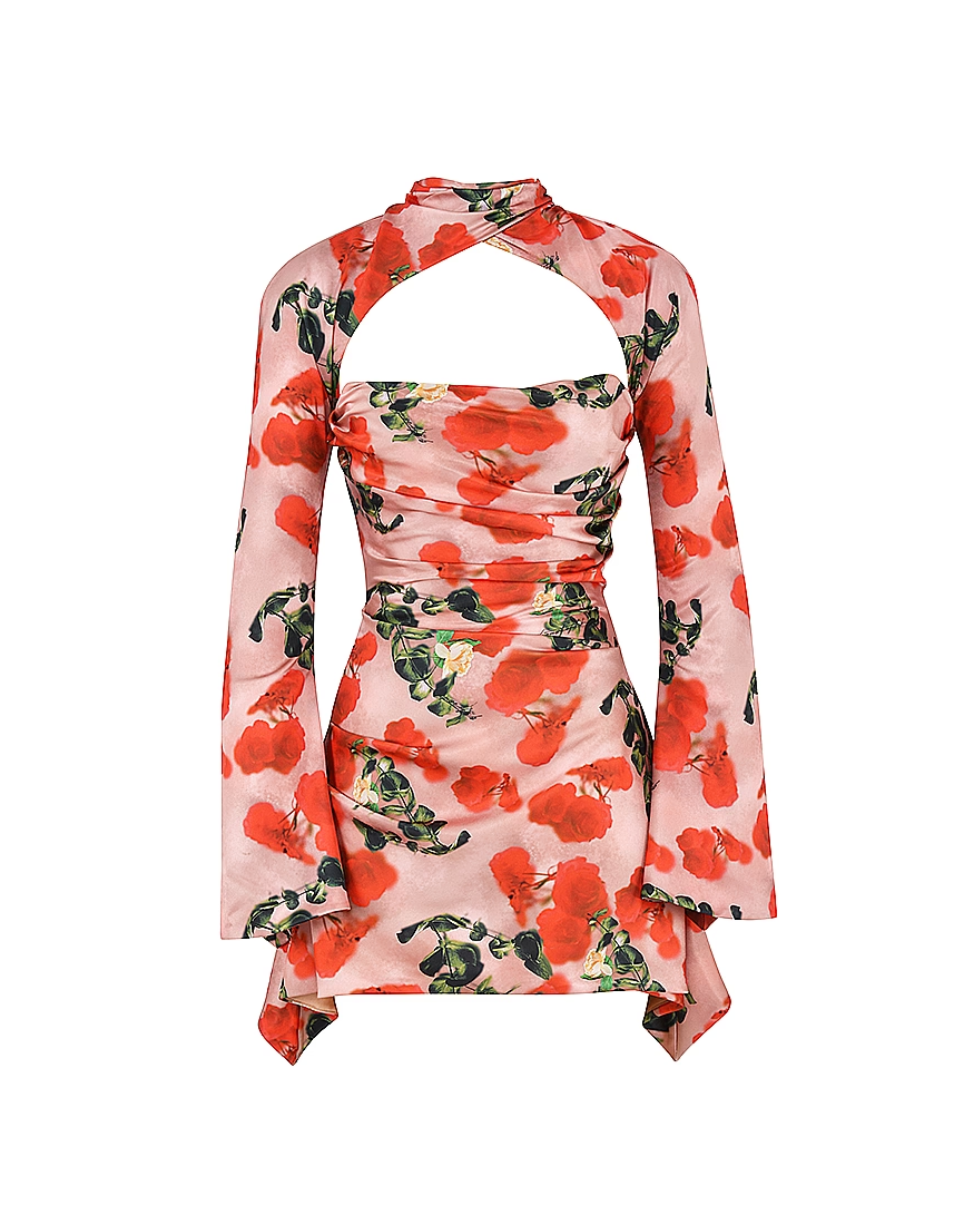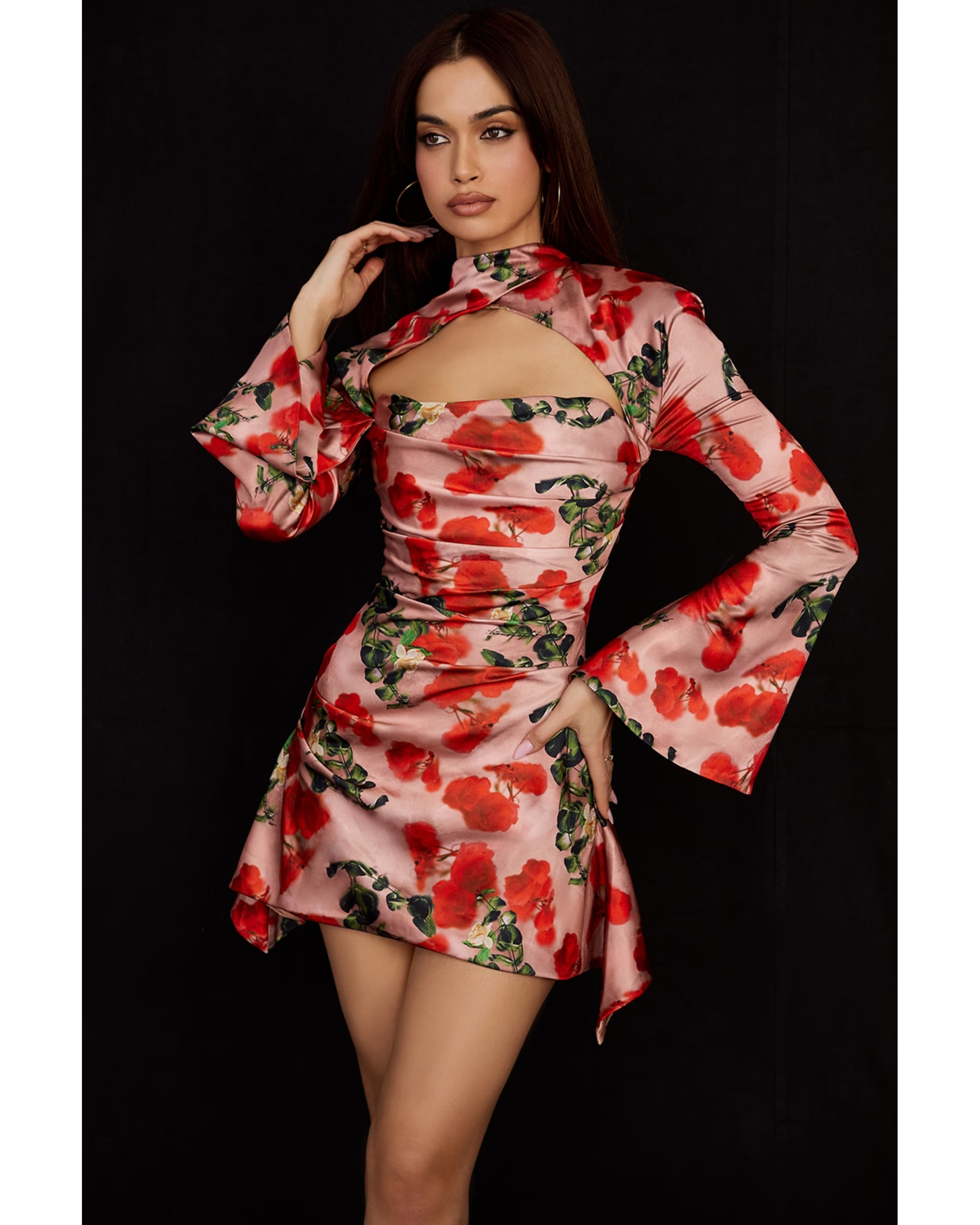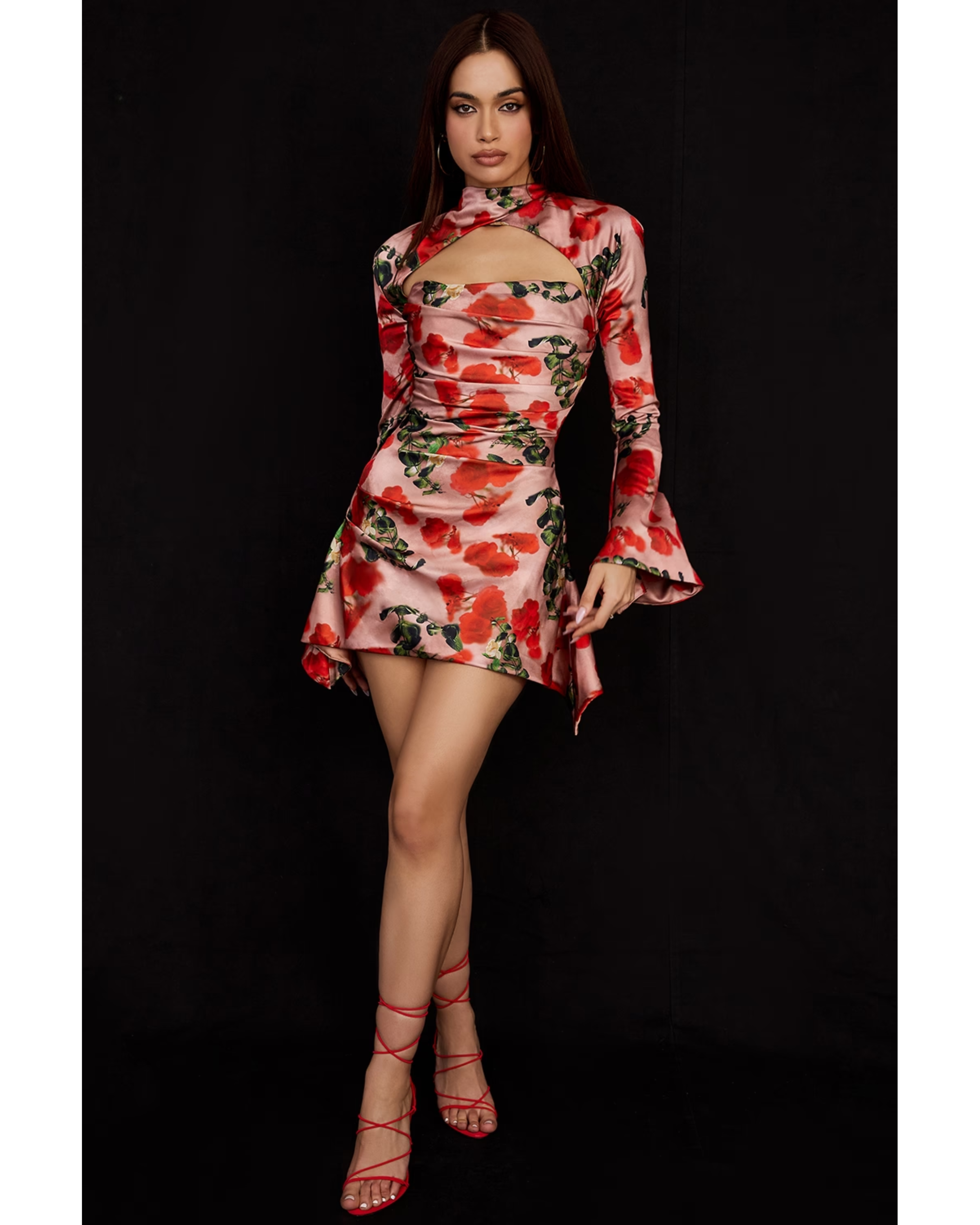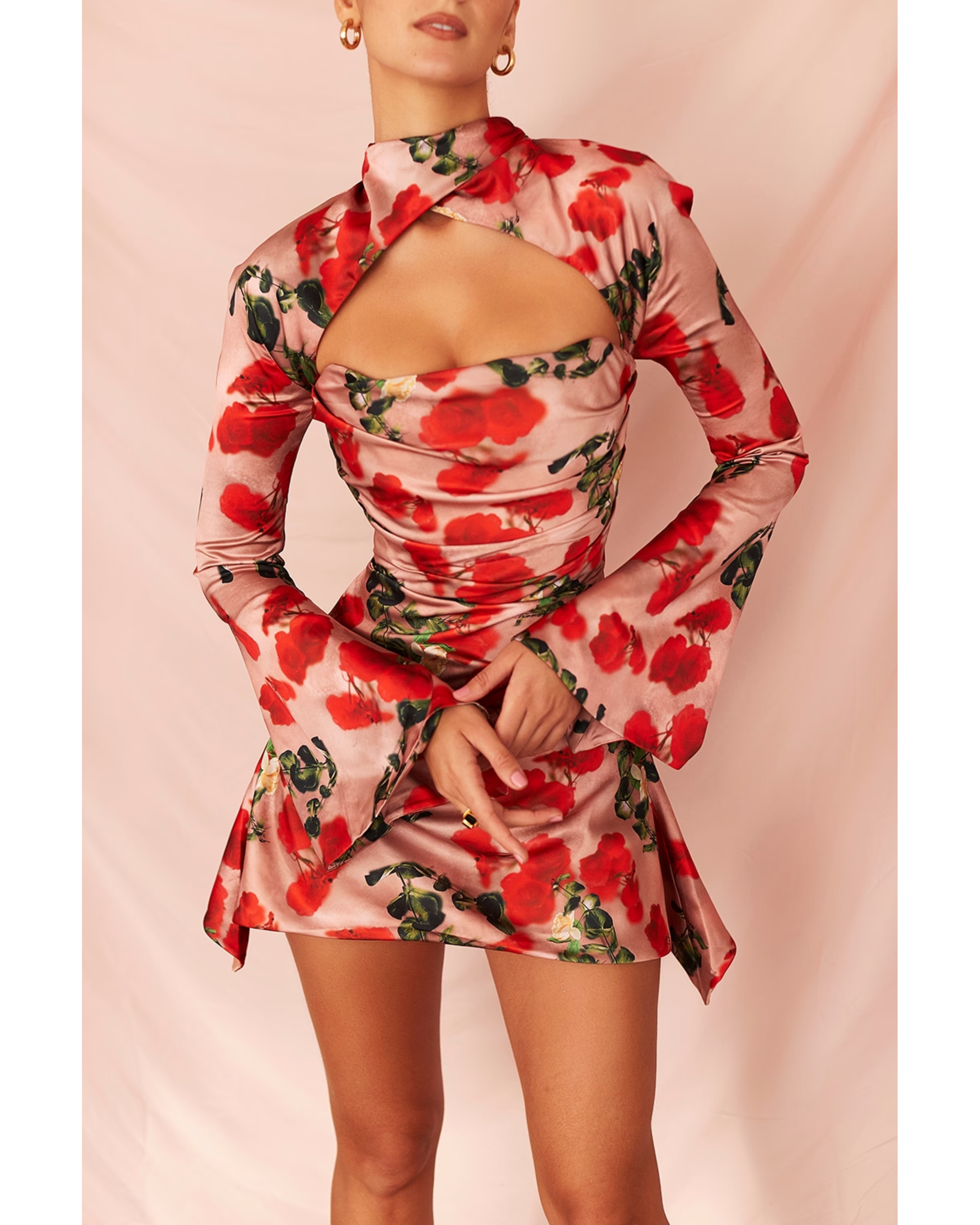 Our 'Toira' mini dress is so fun and flirtatious, making it perfect for romantic date nights. Made from our lustrous silk satin in a pretty floral rose print, 'Toira' is cut on the bias and has so many pretty details. The cross front halter shape is so flattering and creates a skin baring open front with a beautifully draped cowl neckline, fitted with our incredible corsetry boning to really cinch the waist. 'Toira' is fitted at the hips before falling to a slightly fluted hem with a waterfall drape that delicately sweeps across the skirt and down through the arms. The extended sleeves have flared cuffs to add a little drama. It is fully lined for comfort with a zip and button fastening to the back for easy on. Wear yours with dainty mules like 'Lucent'.