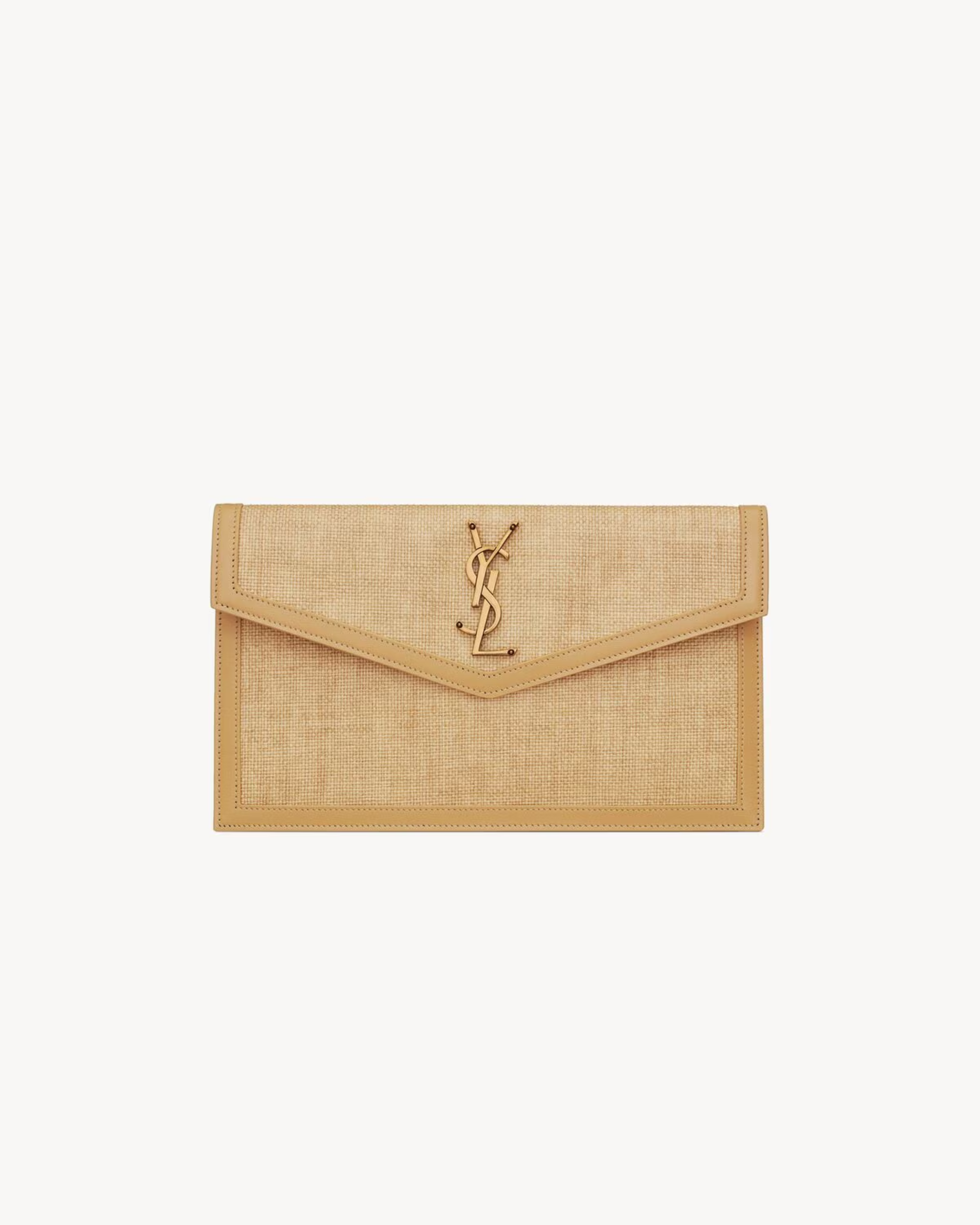 Experience refined elegance with the Saint Laurent Uptown pouch in micro raffia. This exquisite piece combines a delicate, textured exterior with a sleek silhouette, offering a sophisticated accessory that enhances any ensemble. Ideal for those who appreciate subtle luxury, it provides a compact yet stylish solution for carrying essentials.