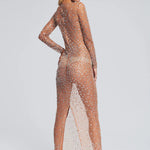 Experience sheer bliss in our Vinci Dress. This long-sleeve, crystal-embellished gown in sheer mesh features a back slit and hidden zipper with hook-and-eye closure at the center back. Shown here in Silver/Nude.