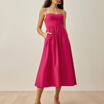 Fitted bodice, A-line skirt, back smocking, tie straps, sweetheart neckline, back zipper. Stretch poplin: 98% organic cotton, 2% spandex.