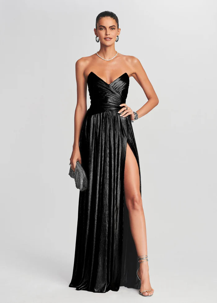 Embrace your inner goddess in our Waldorf Dress. Crafted in lustrous lamé, this two-tone silhouette features ruched panels on the bodice and a floor-length skirt. The strapless neckline and a thigh-high side slit provide the silhouette with a seductively feminine feel. The style is finished with an invisible side zip closure. Shown here in Black.