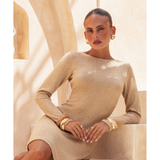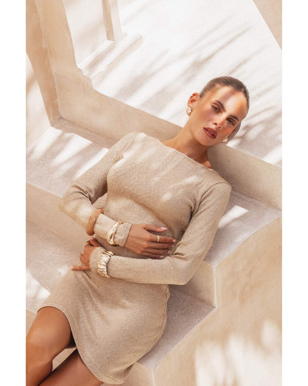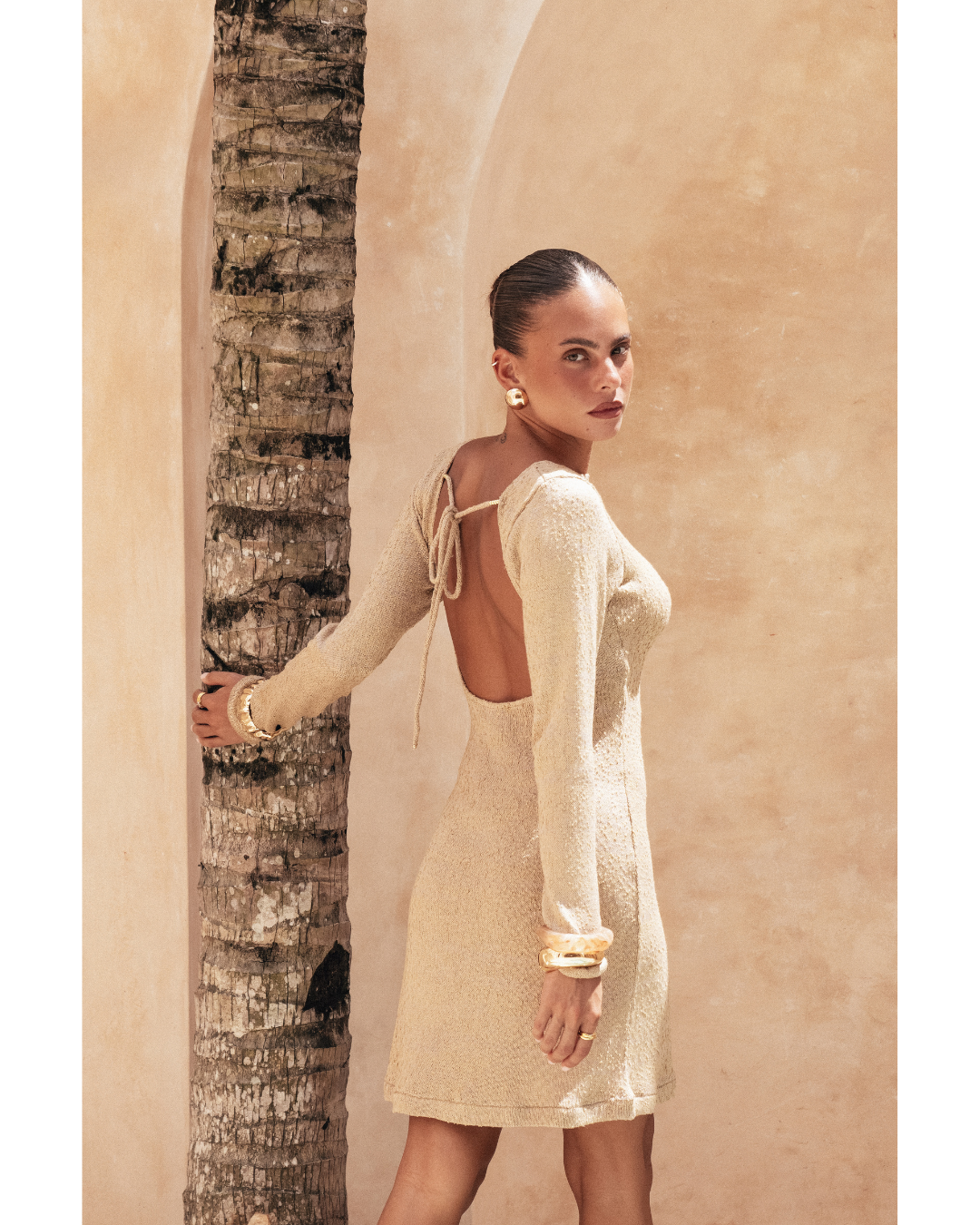 Yasmin is the collection’s shortest silhouette — youthful, free, and sophisticated. With its open back and matte-gold tie details, it’s designed for sun-drenched days and warm desert nights.