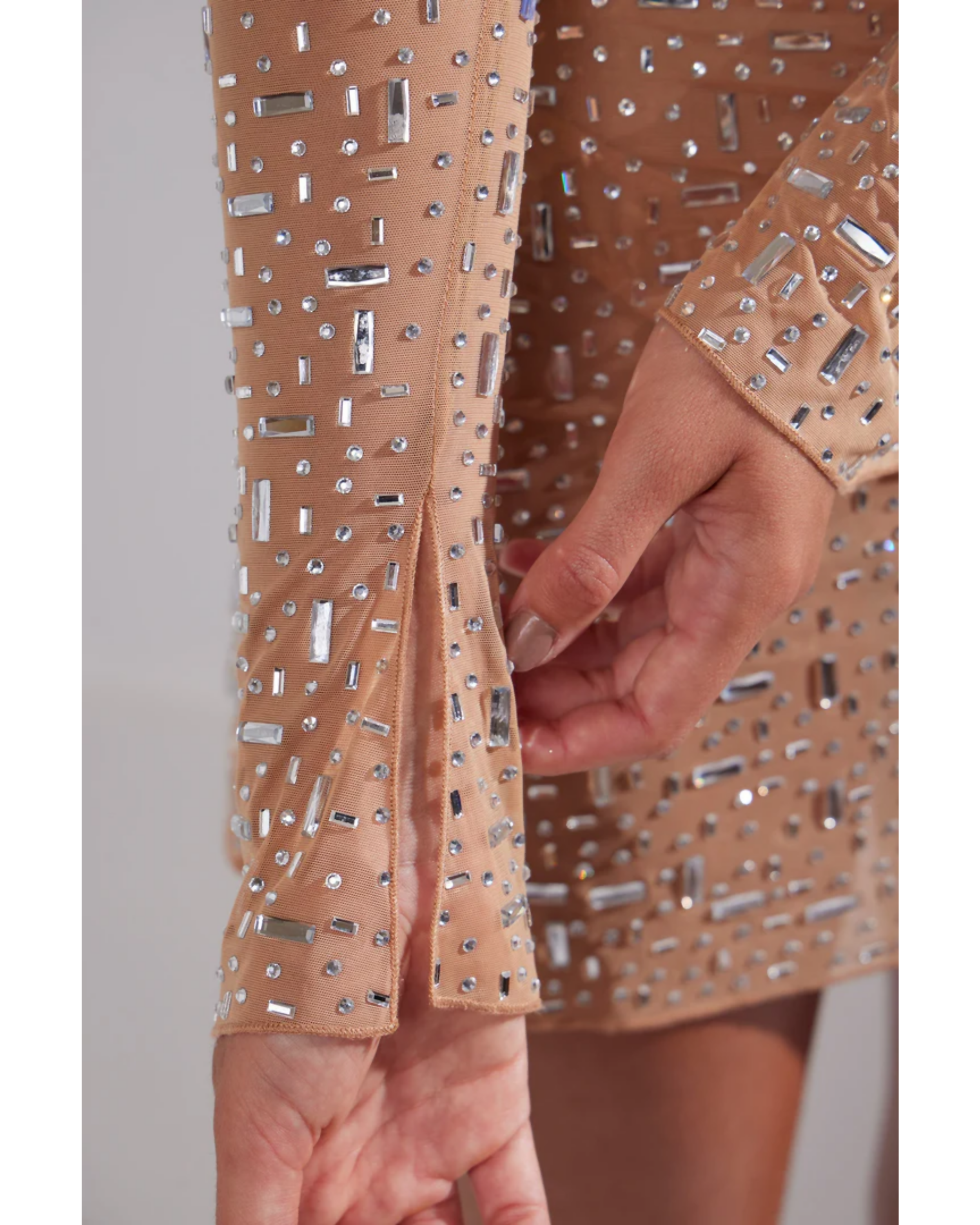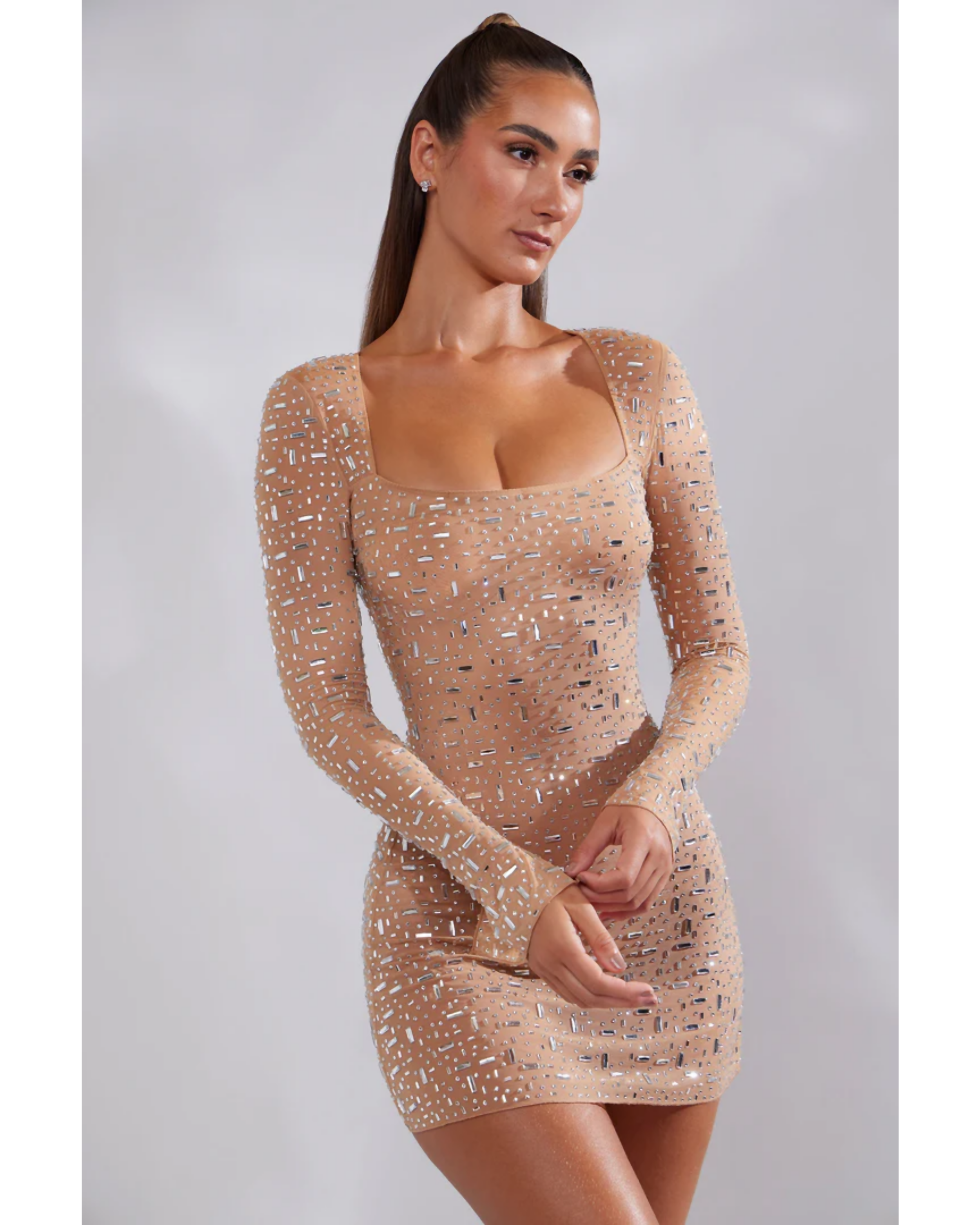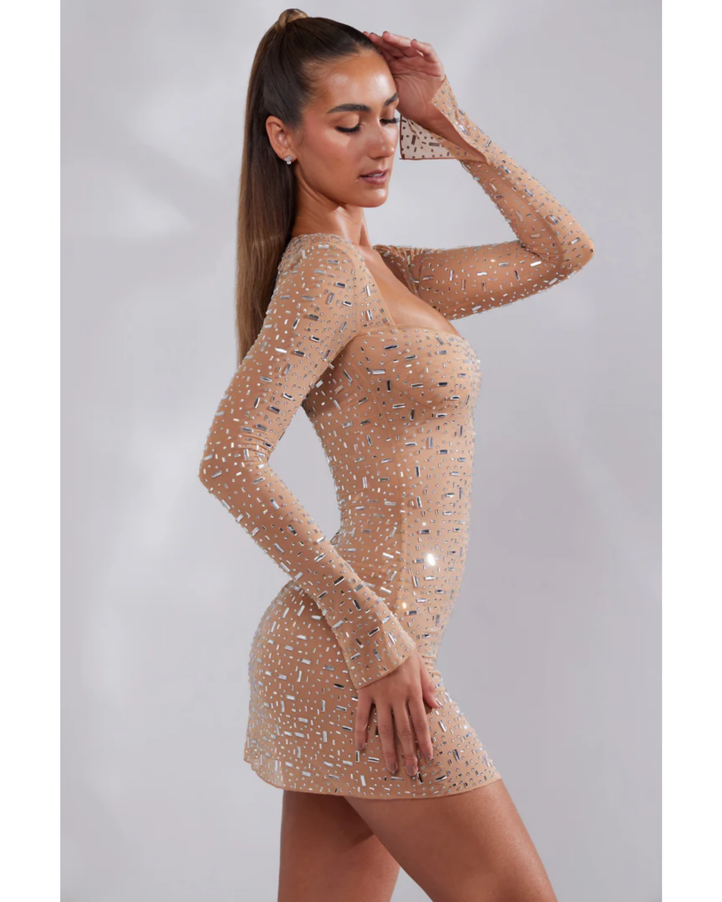 Catch the light. Designed in our premium stretch mesh fabrication with delicate crystal hand embellishment throughout, Zeta is a glittering mini dress made for sparkling evenings. Complete with a square neckline, long embellished sleeves and a thigh-skimming A-line skirt.