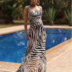 Embrace the magic of monochrome in the Zinnia dress. Crafted in bold zebra print, this floor-skimming maxi features a draped cowl neckline, elegant cross-strap back, and a side slit skirt for a striking finish. A statement style designed for dramatic entrances.